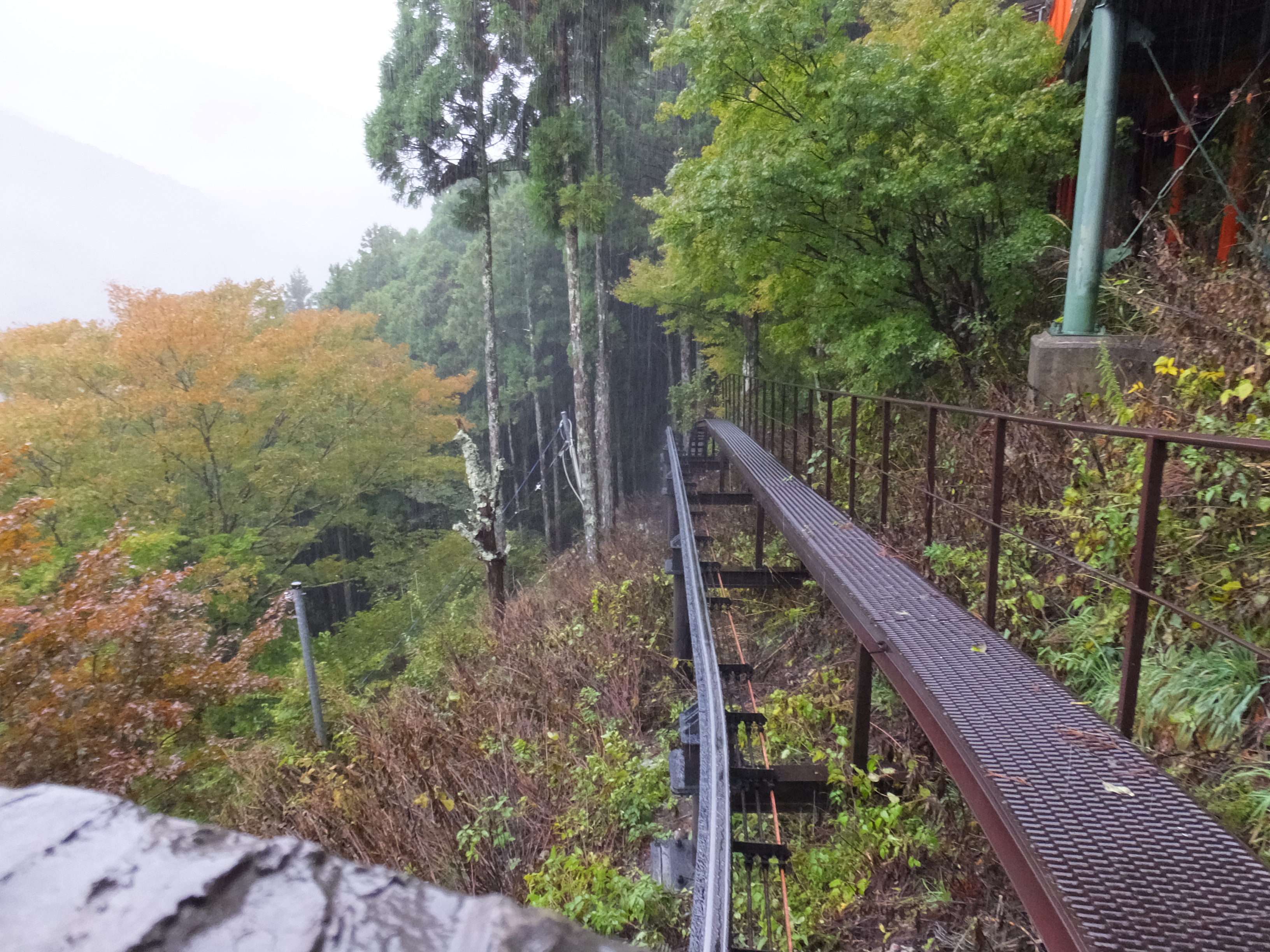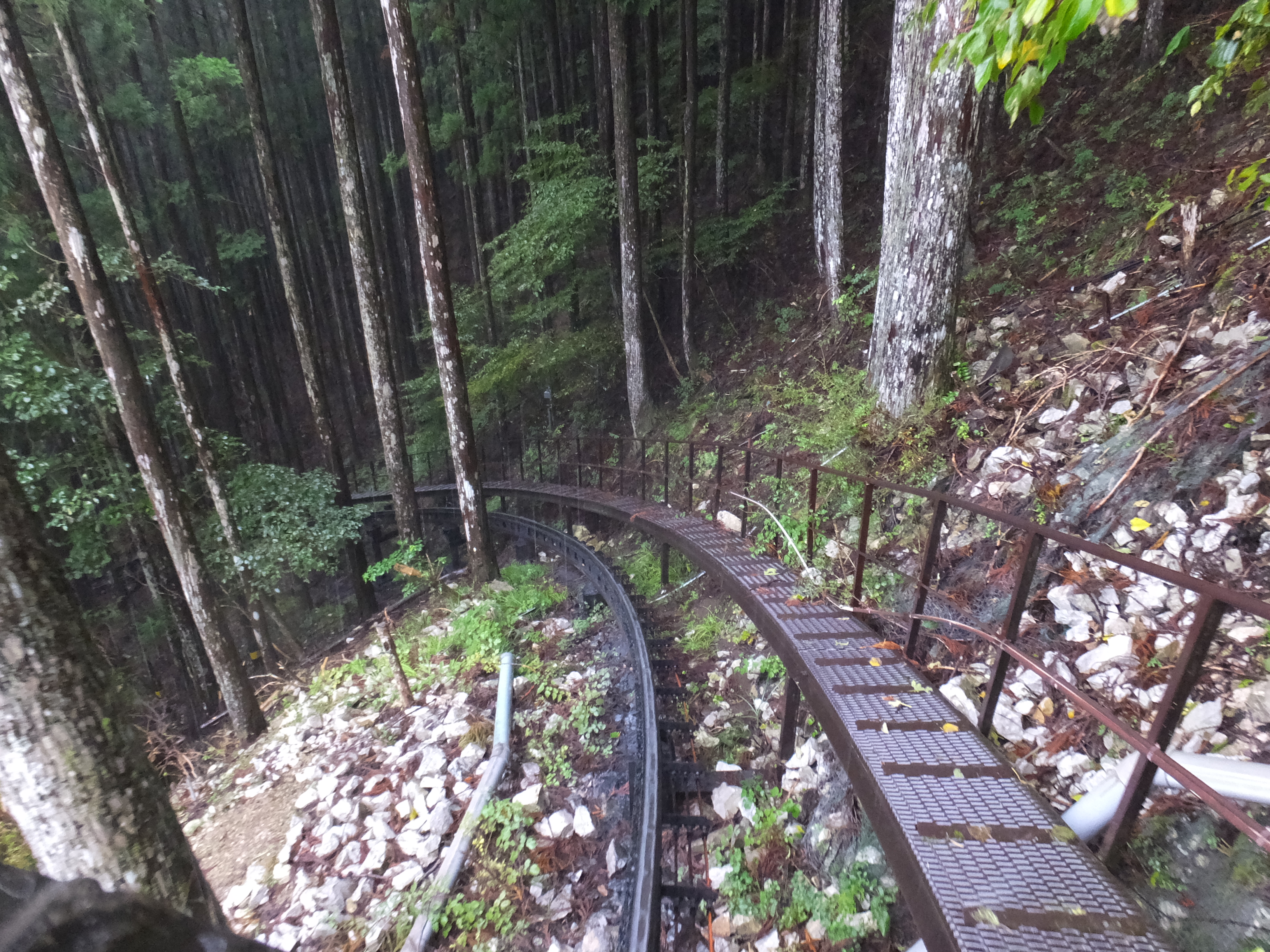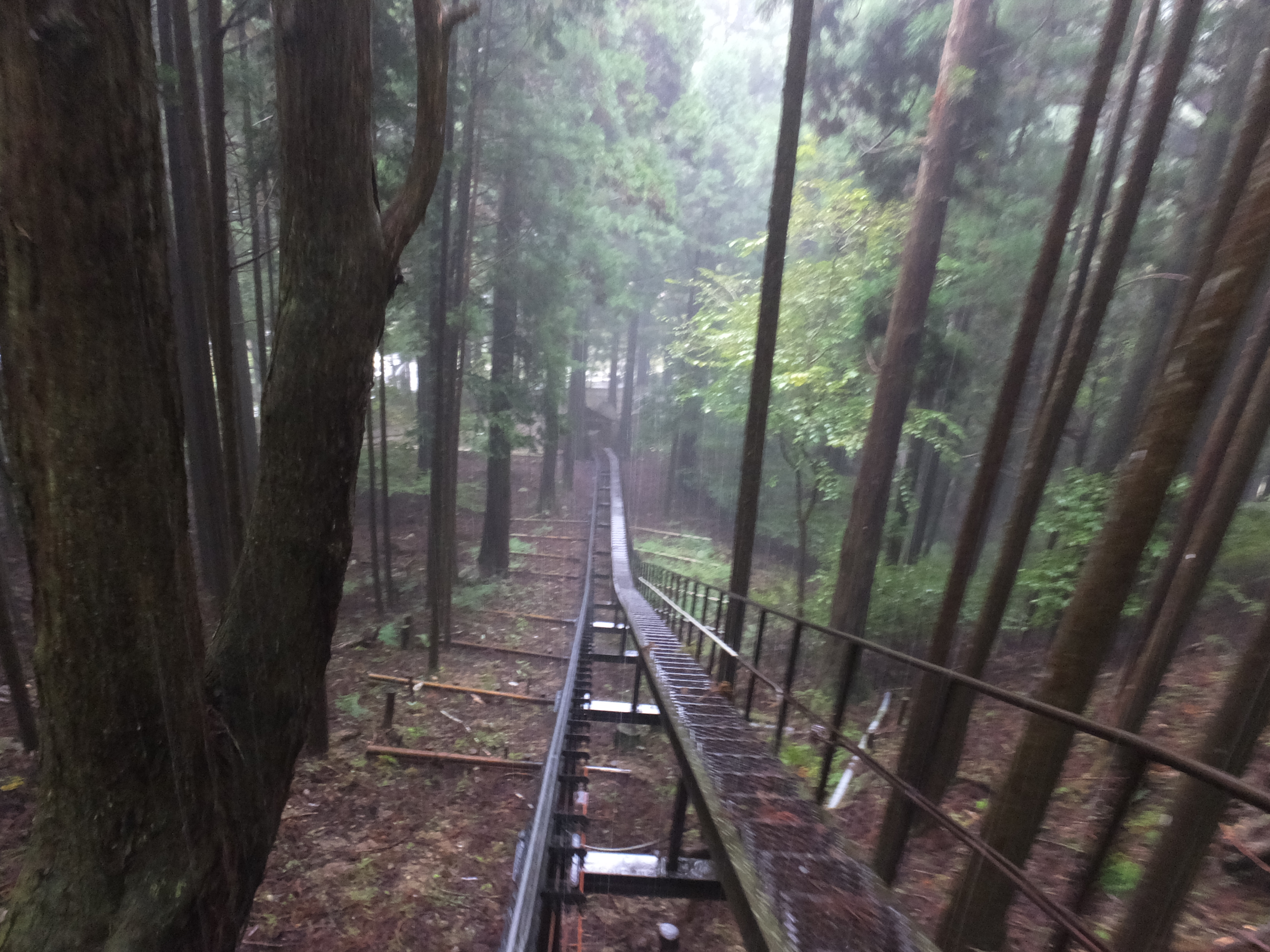この角度すごいでしょ!ちょっと怖めのジェットコースターくらいはありますよ!でも、スピードはゆっくりですし、私のような雨男でも安心設計となっており、雨除けの透明シートがついてます!これで雨男、雨女のあなたも安心して上まで上がれますよね(遠い目) そうこうしている間に上に到着です、トロッコの乗車時間は約3~4分くらいだったでしょうか。透明シートの隙間から撮影するのに必死だったため正確な時間覚えておりません!