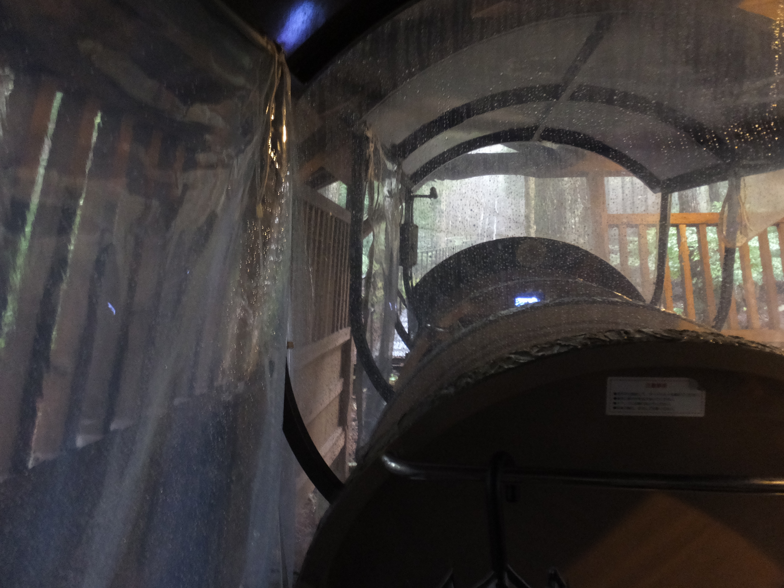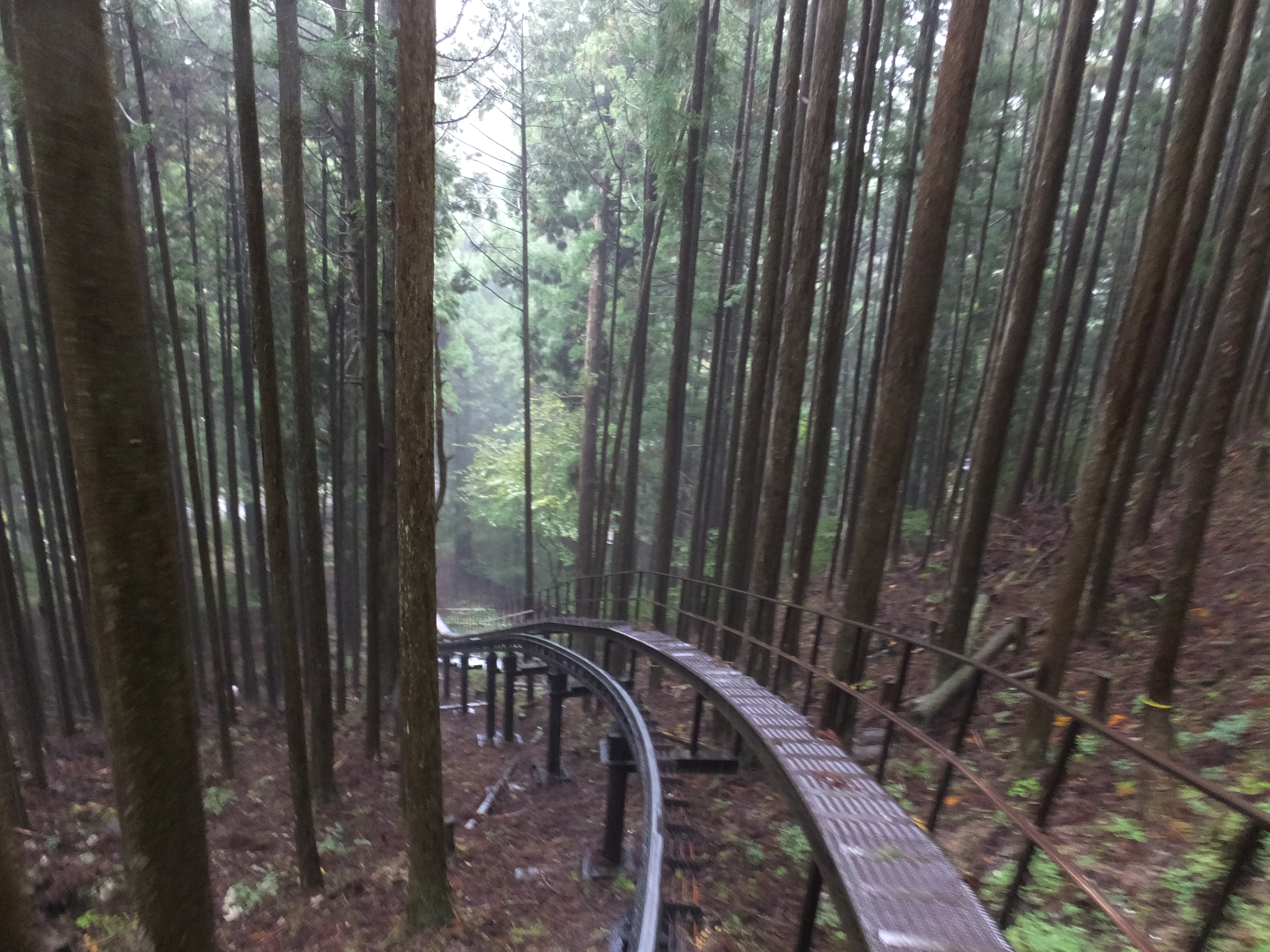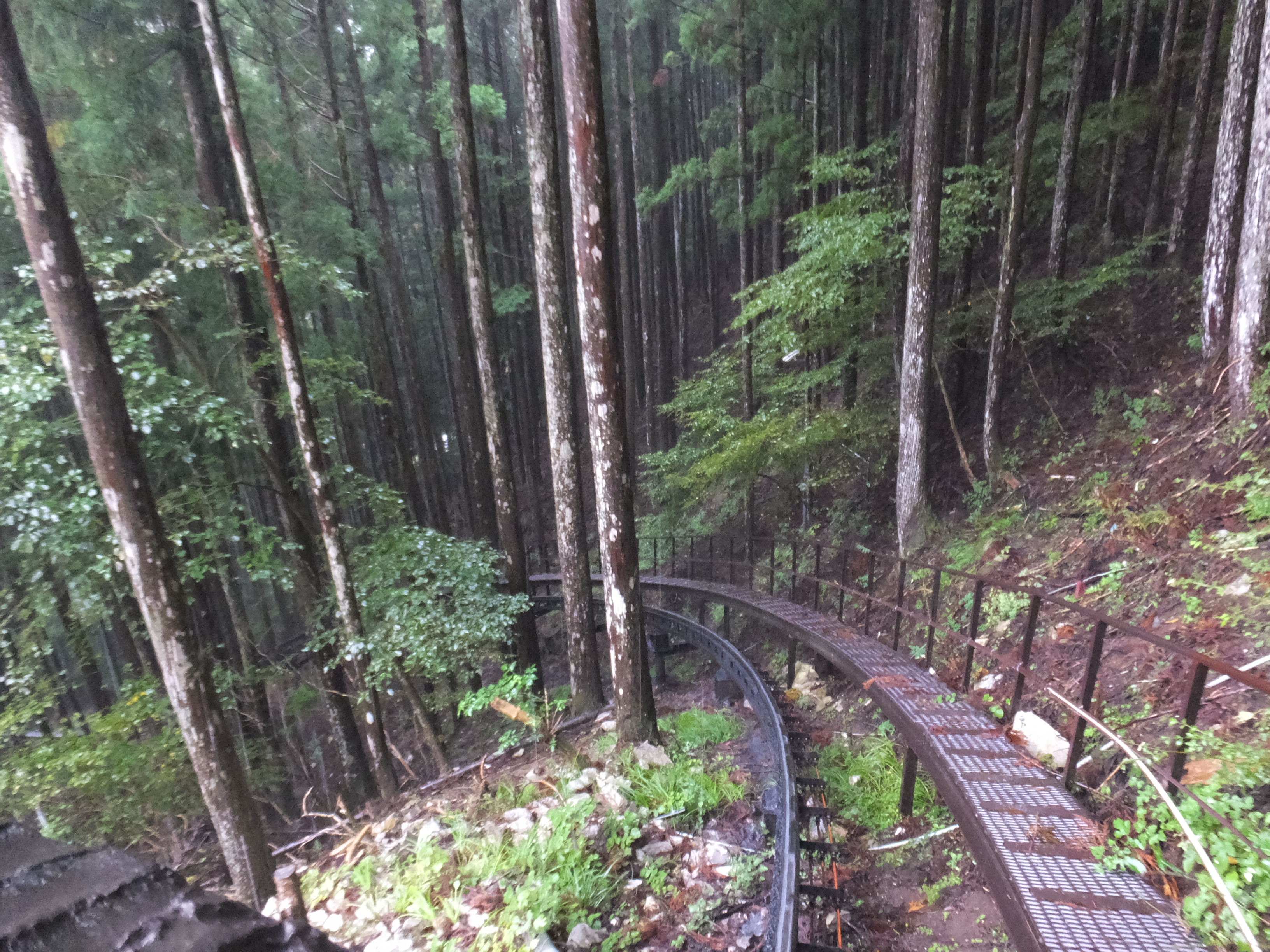 この角度すごいでしょ!ちょっと怖めのジェットコースターくらいはありますよ!でも、スピードはゆっくりですし、私のような雨男でも安心設計となっており、雨除けの透明シートがついてます!これで雨男、雨女のあなたも安心して上まで上がれますよね(遠い目) そうこうしている間に上に到着です、トロッコの乗車時間は約3~4分くらいだったでしょうか。透明シートの隙間から撮影するのに必死だったため正確な時間覚えておりません!