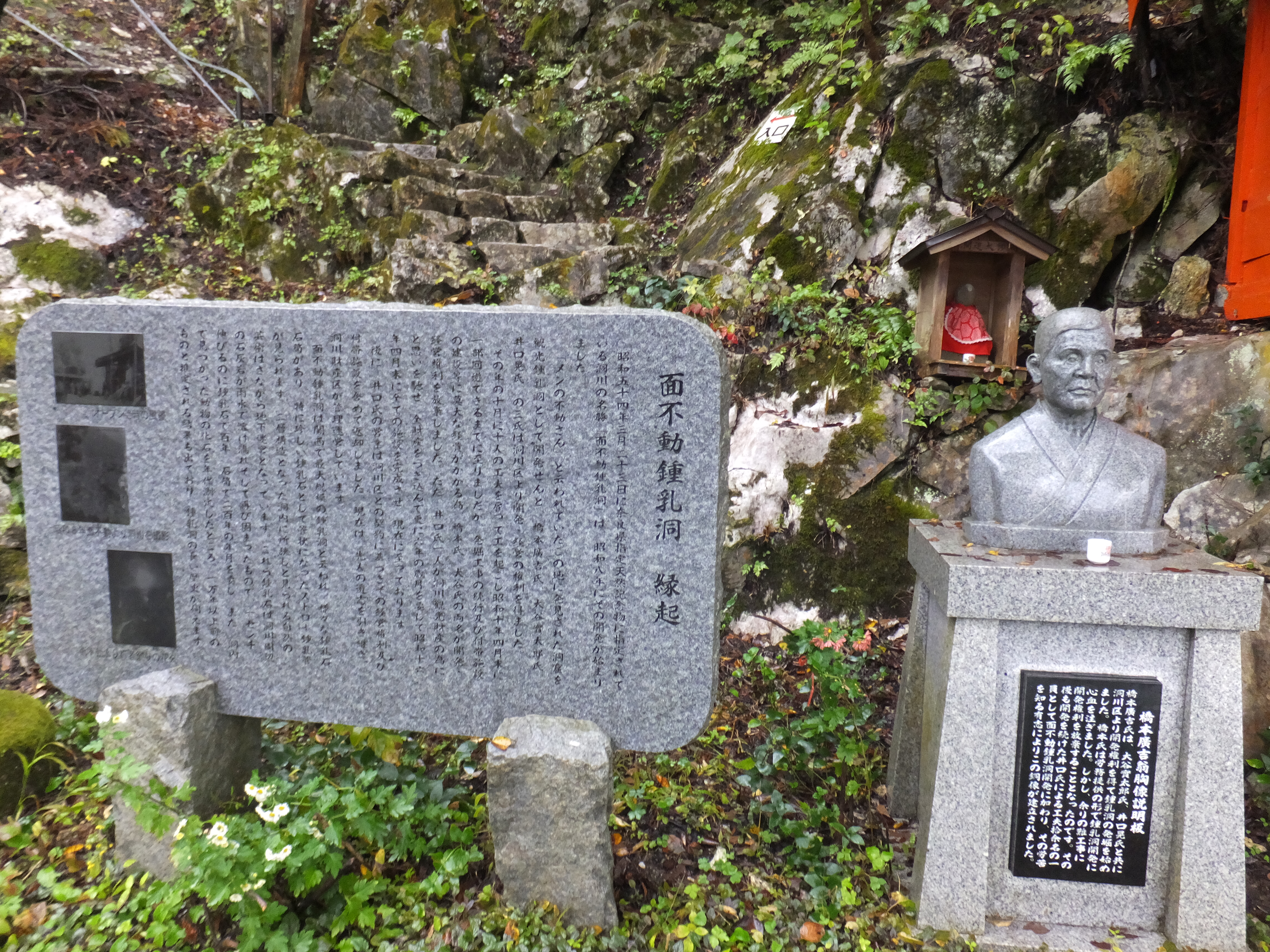 上からの風景はとてもきれいです!この写真を見ていただければ、結構高い位置にあるのがわかっていただけるかと思います。それにこの日は雨ということもあり、山々にかかる雲とのコントラストもすごく幻想的!この日たまたま幸運にも雨だったのでね← ということで、上についた後トロッコの往復料金と面不動鍾乳洞に入る料金をお支払いして横をみると橋本廣吉さんがお出迎え!この方が面不動鍾乳洞を発掘した方、ありがとうございますこんな素敵な鍾乳洞を見つけてくださって、まだ入ってませんが絶対素敵だと思います。秋芳洞など有名な鍾乳洞を行くのはもちろんですが、このような秘境の地にありマイナーな鍾乳洞っていうのは情報も少ないので、おらわくわくすっぞー(孫悟空風)