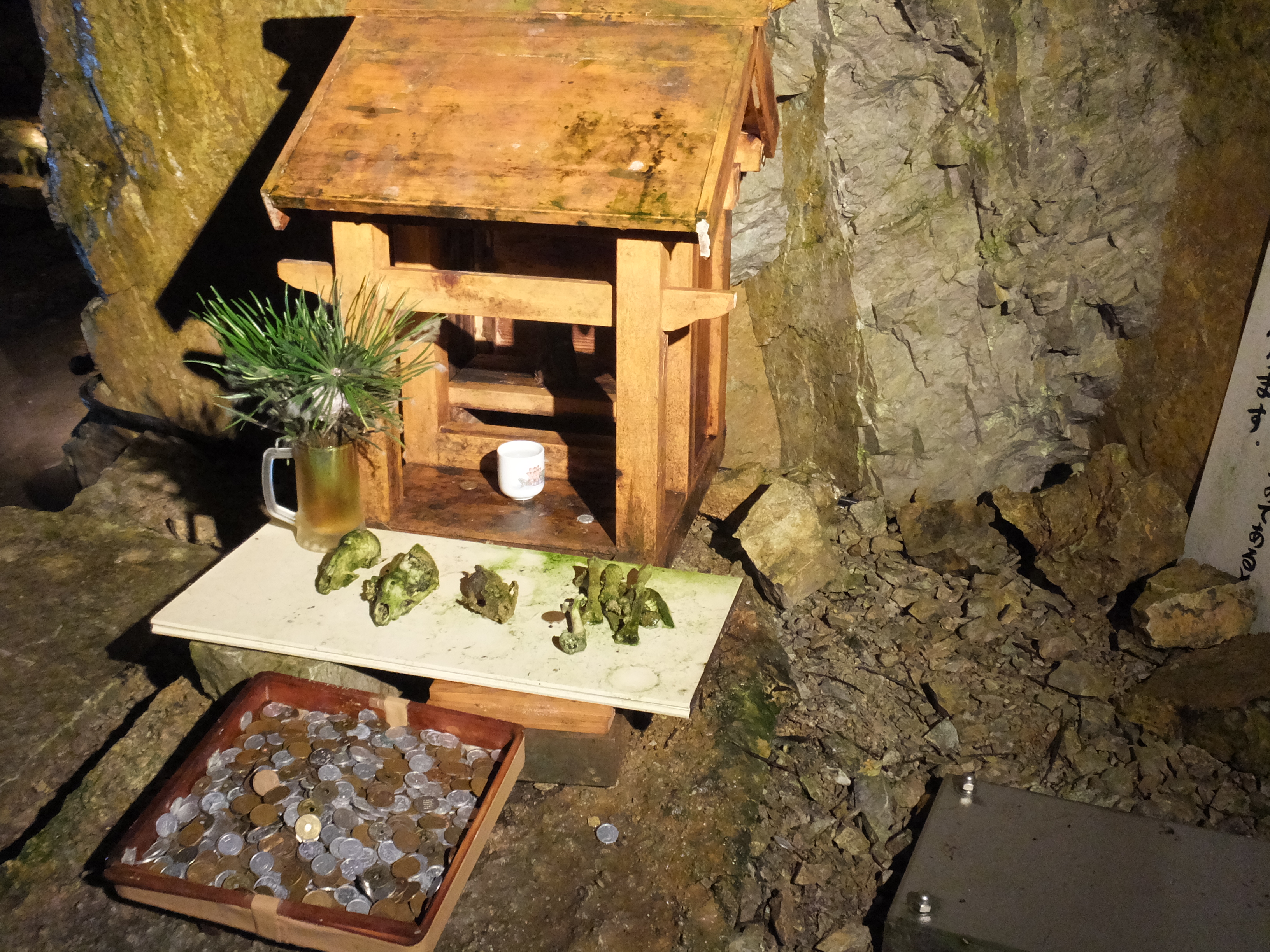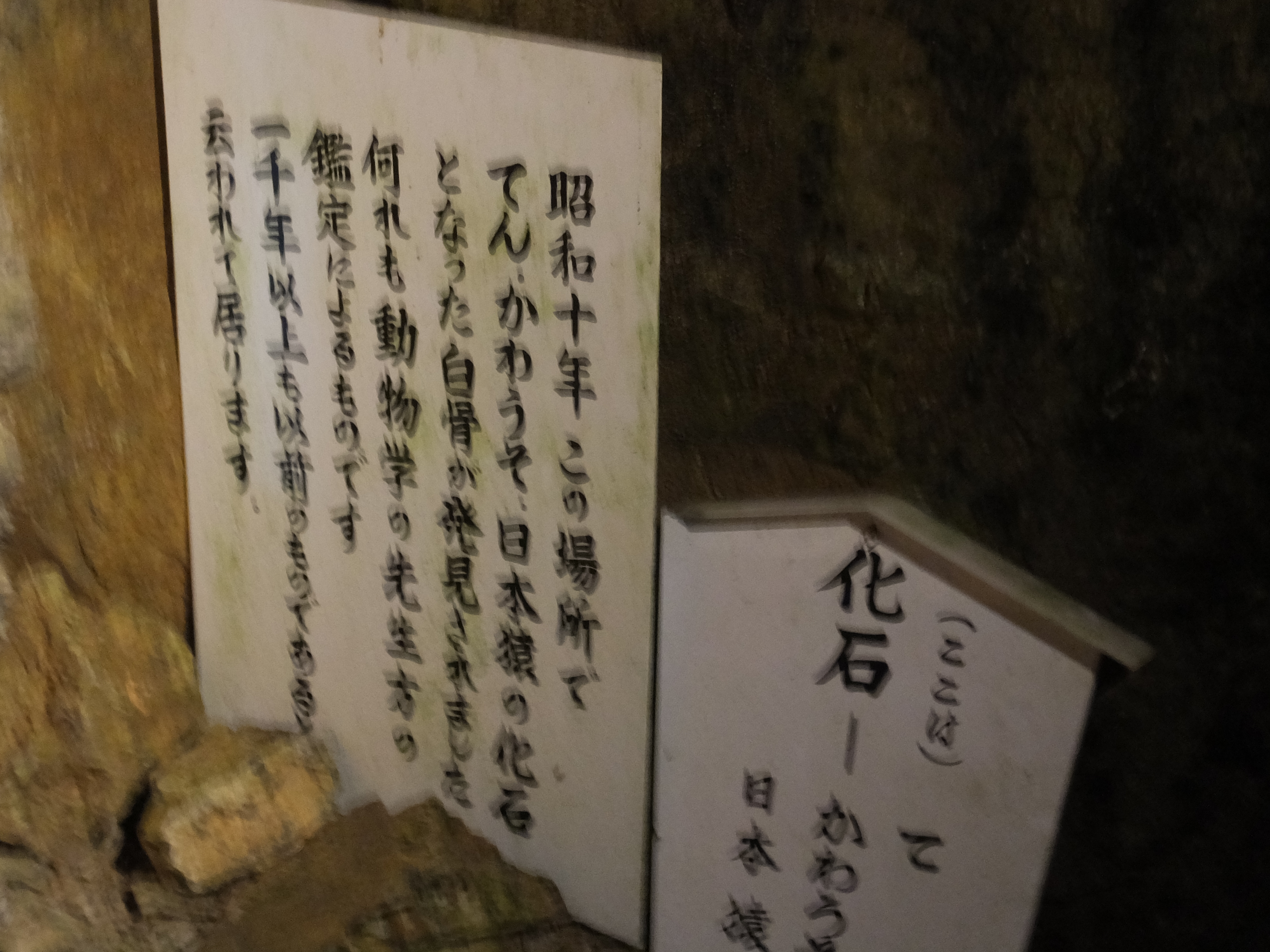 紹介はこれだけでは終わりません。窟の最後のほうに急に出てくる祠、てん、かわうそ、ニホンザルの化石だそうです。昭和10年にこの鍾乳洞で発見されたのですが、動物学の先生に確認してもらったところ1000年以上も前のものだそうです。 面不動鍾乳洞内部 - 化石