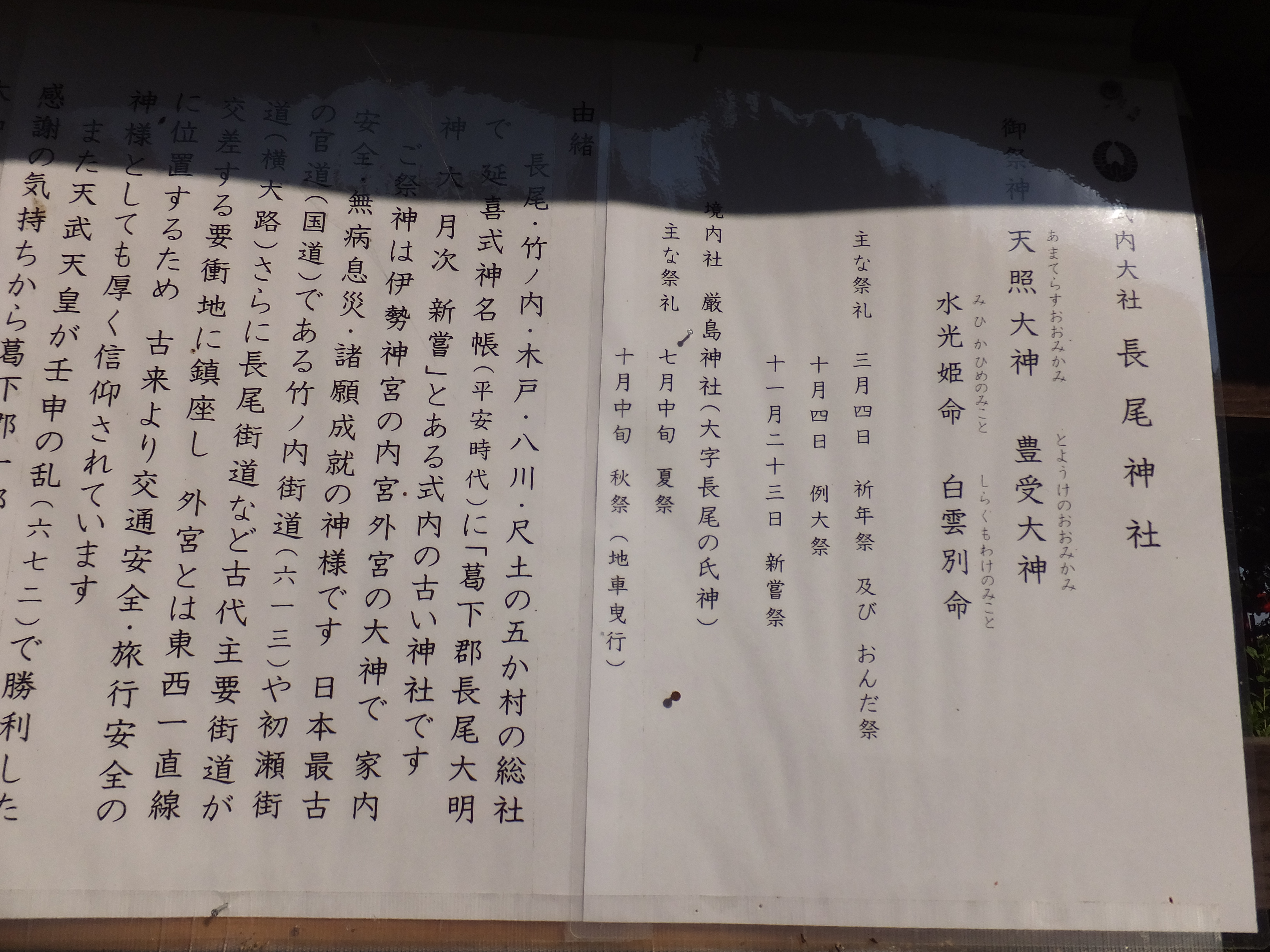 この拝殿は昭和11年に新築されたそうです。まさしく葛城山にお参りするような気持ちでした。この長尾神社は日本で一番古い官道竹ノ内街道と長尾街道が交差する交通の要衝で、あの神社本庁の本宗伊勢神宮と東西一直線で結ばれている場所にあるという、皇室の氏神である伊勢神宮と一直線で結ばれてるとか、絶対何かありますよね!
