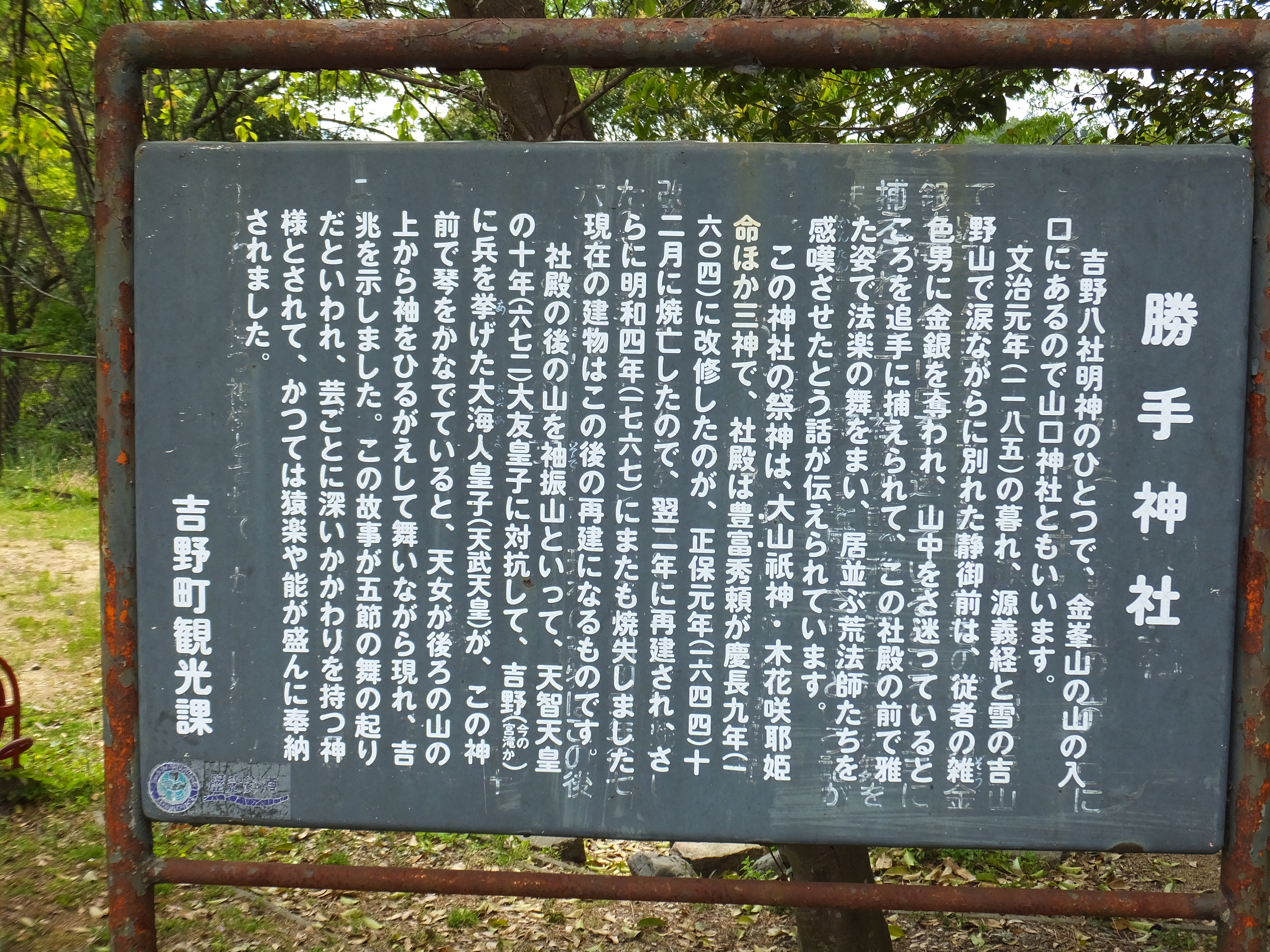 源義経は、鎌倉幕府の初代将軍・源頼朝は異母兄で河内源氏の源義朝の九男として生まれ、幼名を牛若丸と呼ばれていました。平治の乱で父が敗死したことにより鞍馬寺に預けられたがのちに平泉へ下り、奥州藤原氏の当主・藤原秀衡の庇護を受ける。兄・頼朝が平氏打倒の兵を挙げるとそれに馳せ参じ、一ノ谷・屋島・壇ノ浦の合戦を経て平氏を滅ぼし(源平合戦)最大の功労者となった。しかし、その後頼朝の許可を得ることなく官位を受けたことや、平氏との戦いにおける独断専行によって怒りを買い、このことに対し自立の動きを見せたため、頼朝と対立し朝敵とされました。謀反にも失敗した義経は郎党や静御前を連れて吉野に身を隠したが、ここでも追討を受けて静御前が捕らえられたのがこの勝手神社です。その際静御前が舞った場所には舞塚が今も残っております。