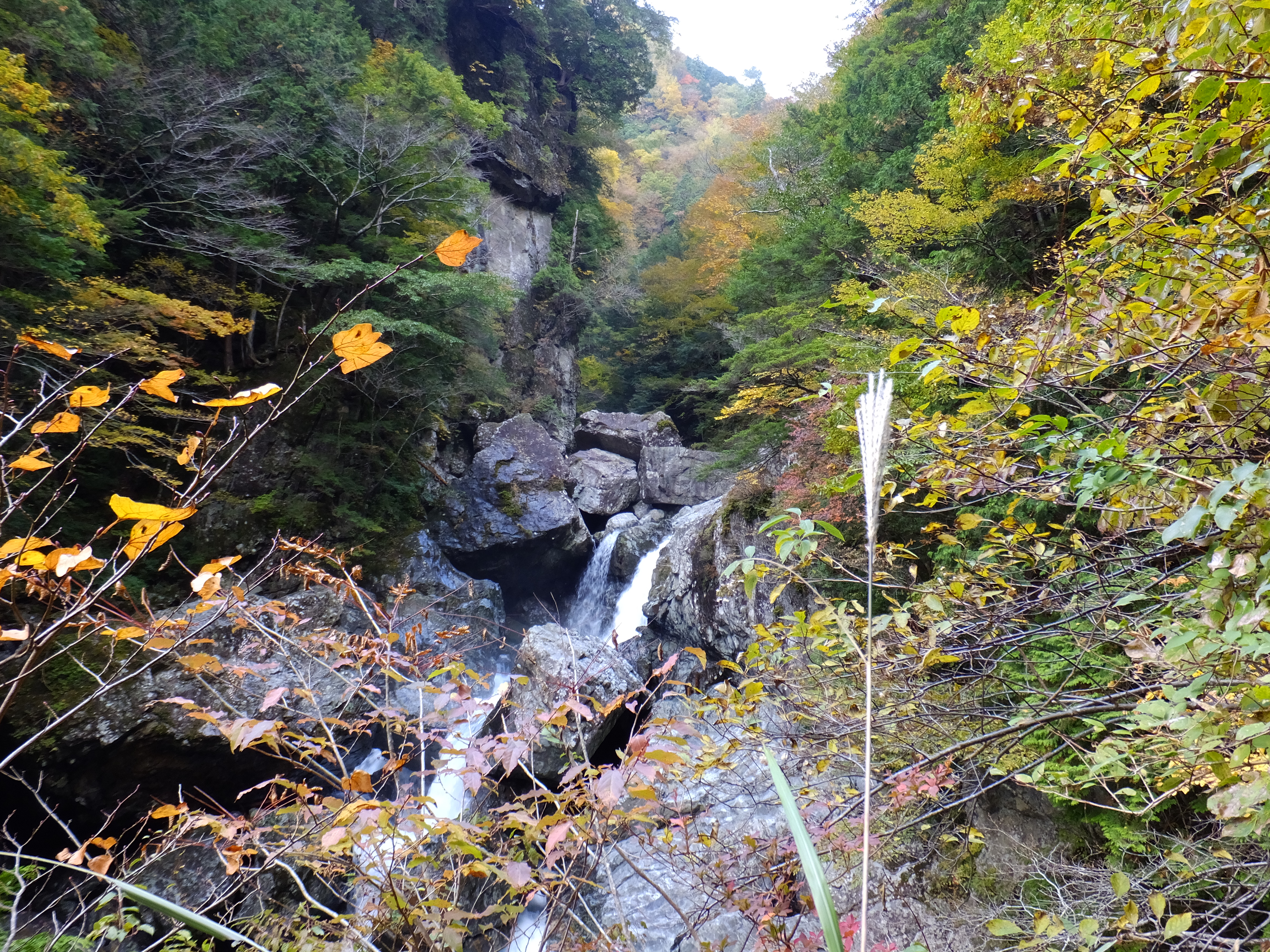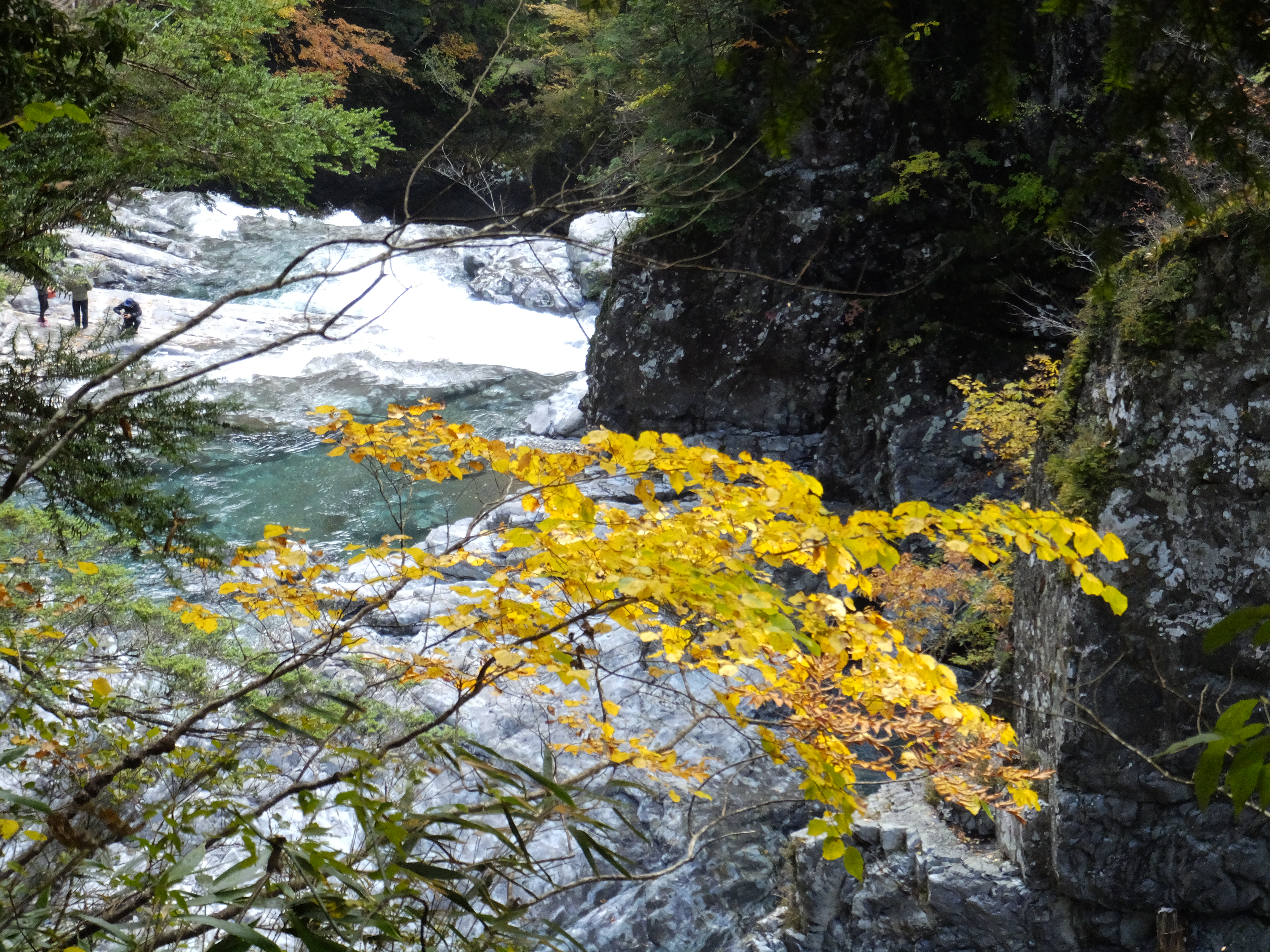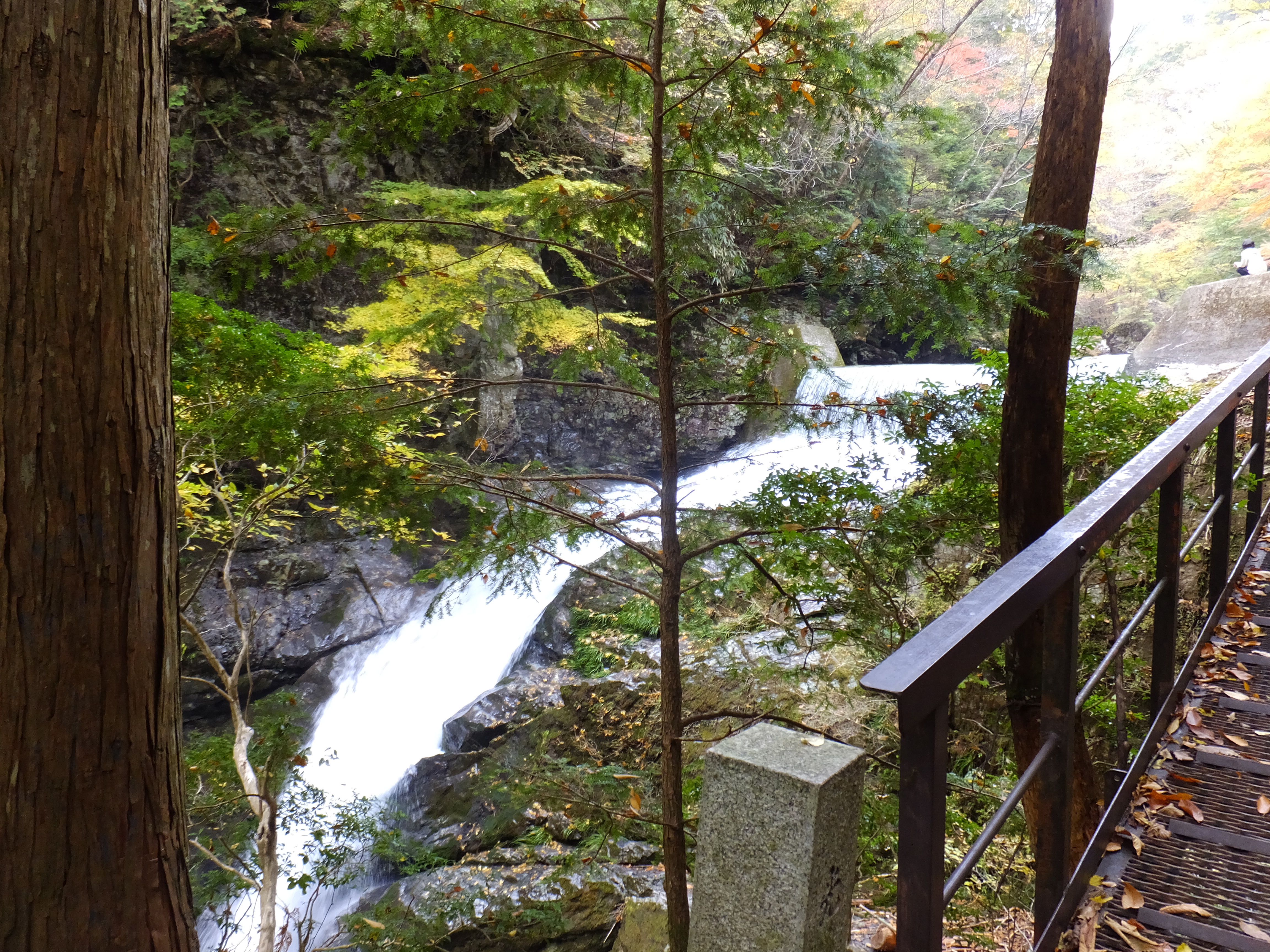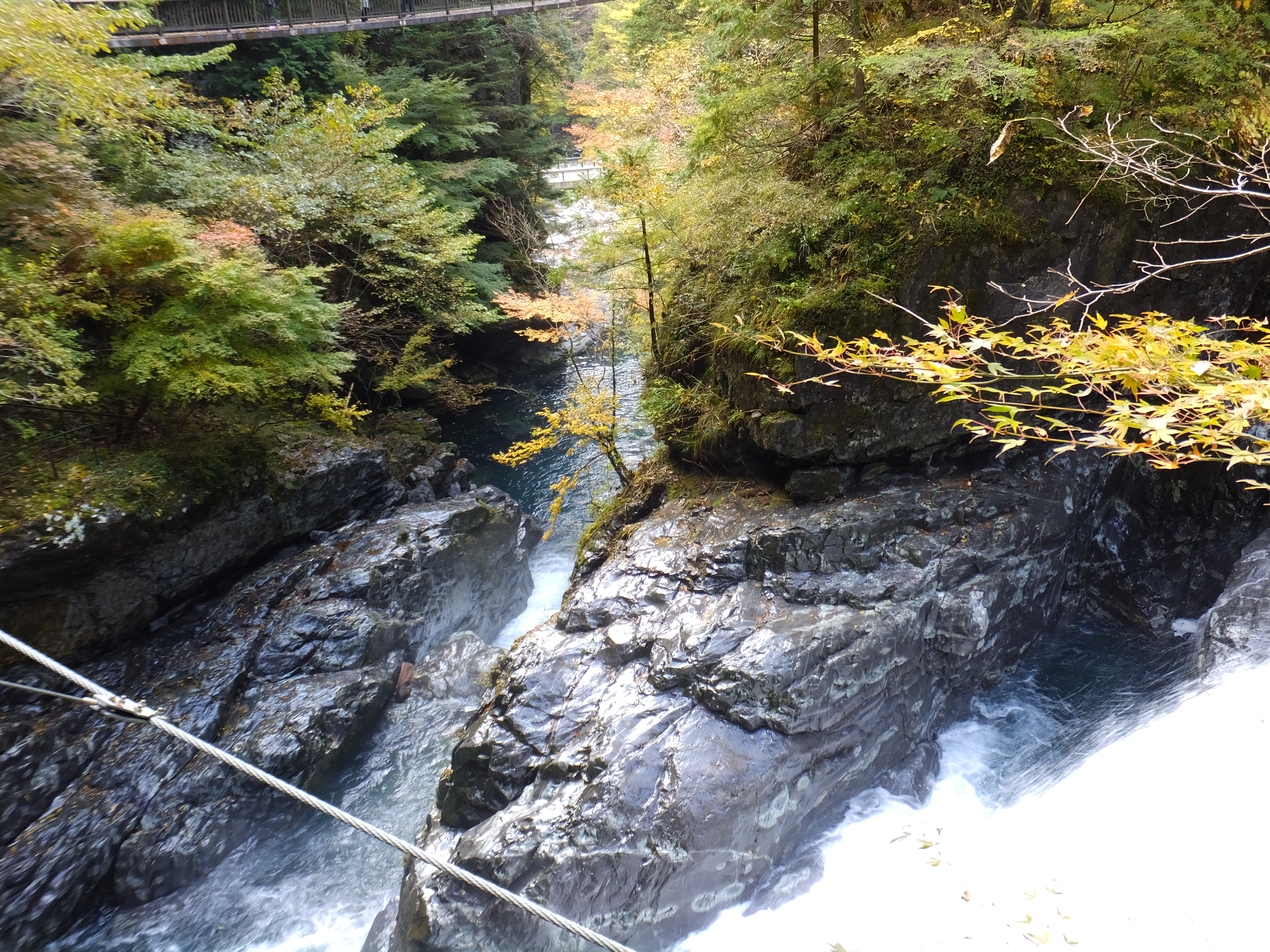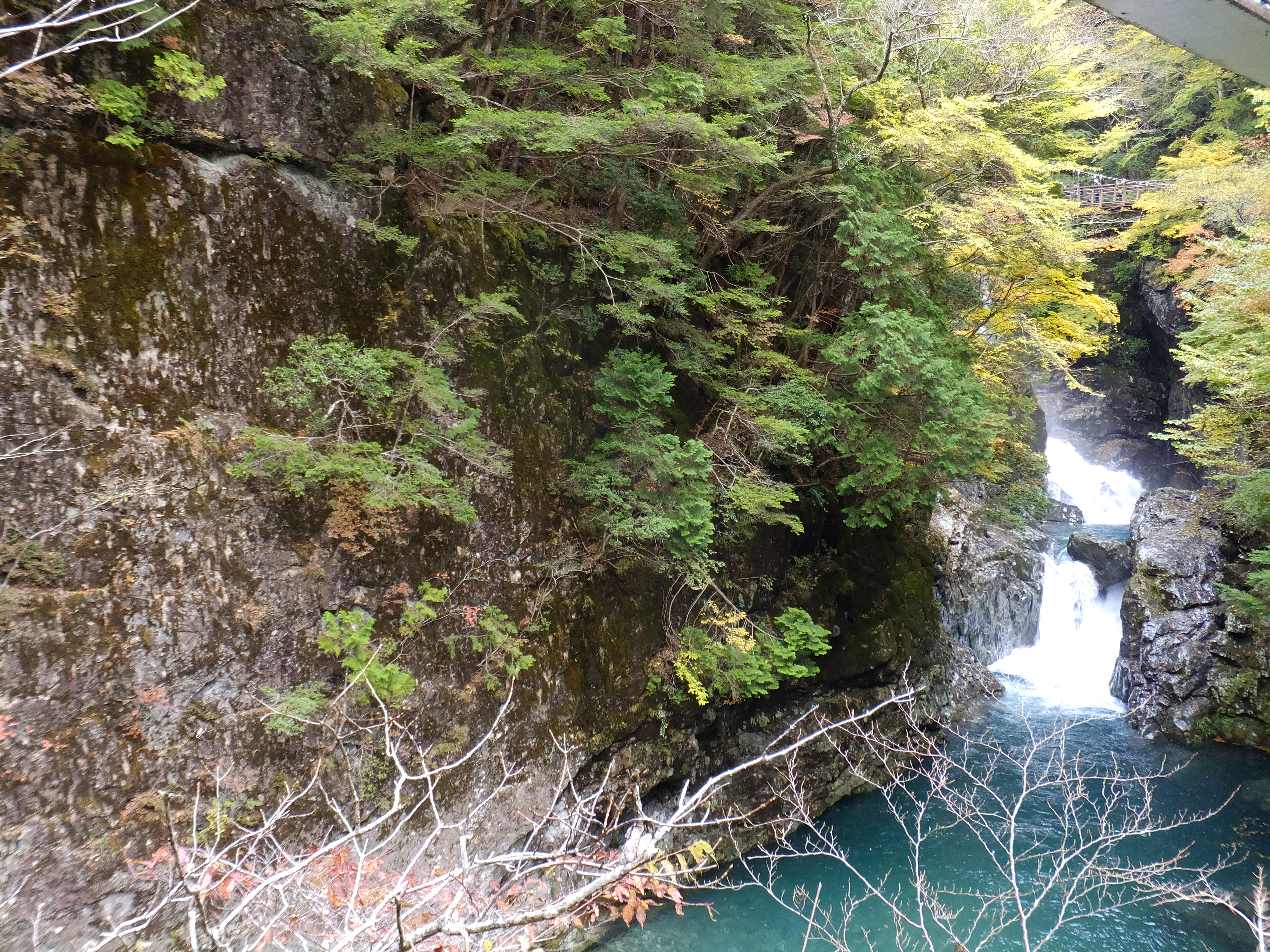 遊歩道入り口から階段になっており、上がっていくとこの風景!上から見ると滝になっていて岩もごつごつしててすごい渓谷!それと紅葉がマッチしてます。
