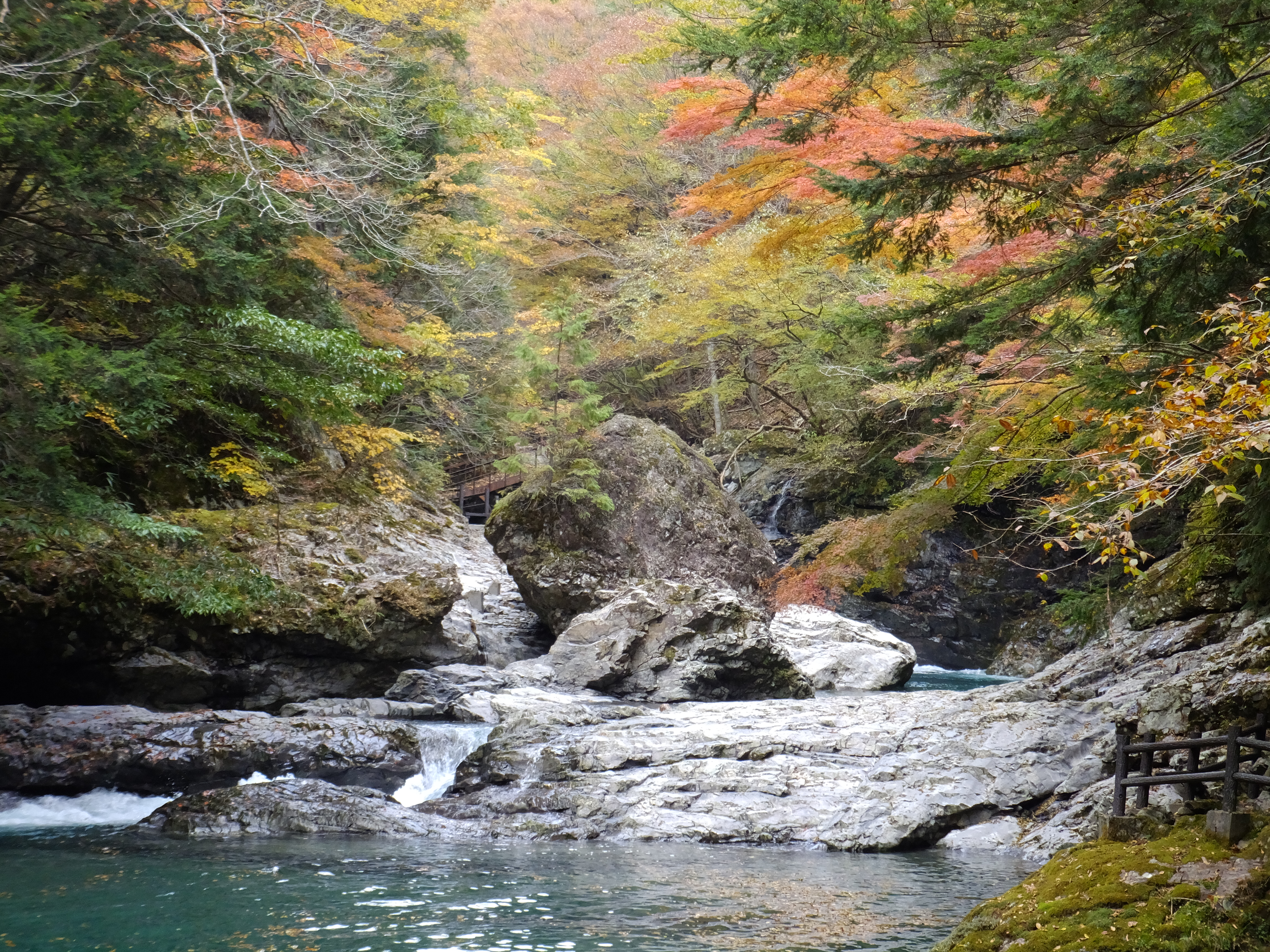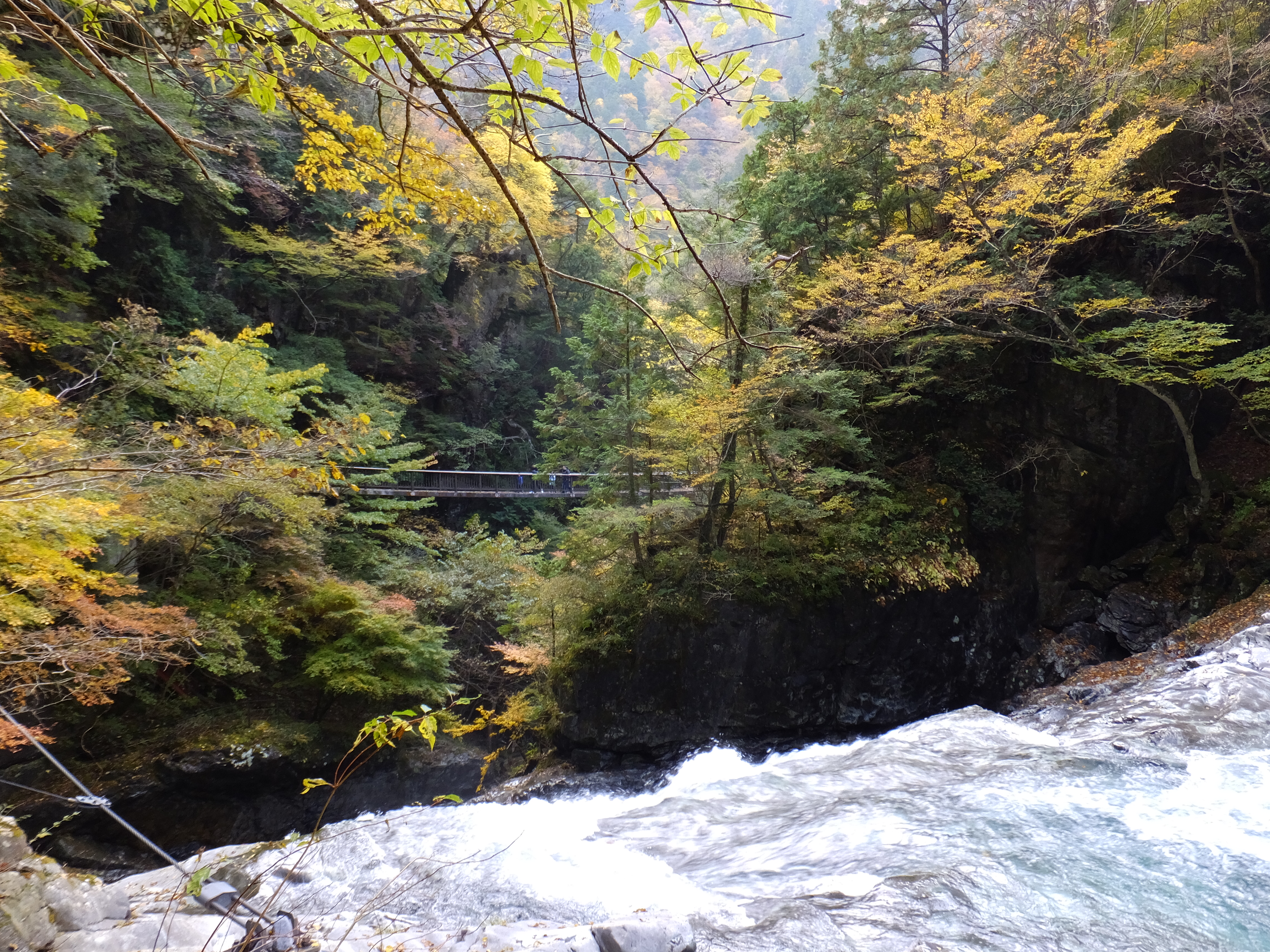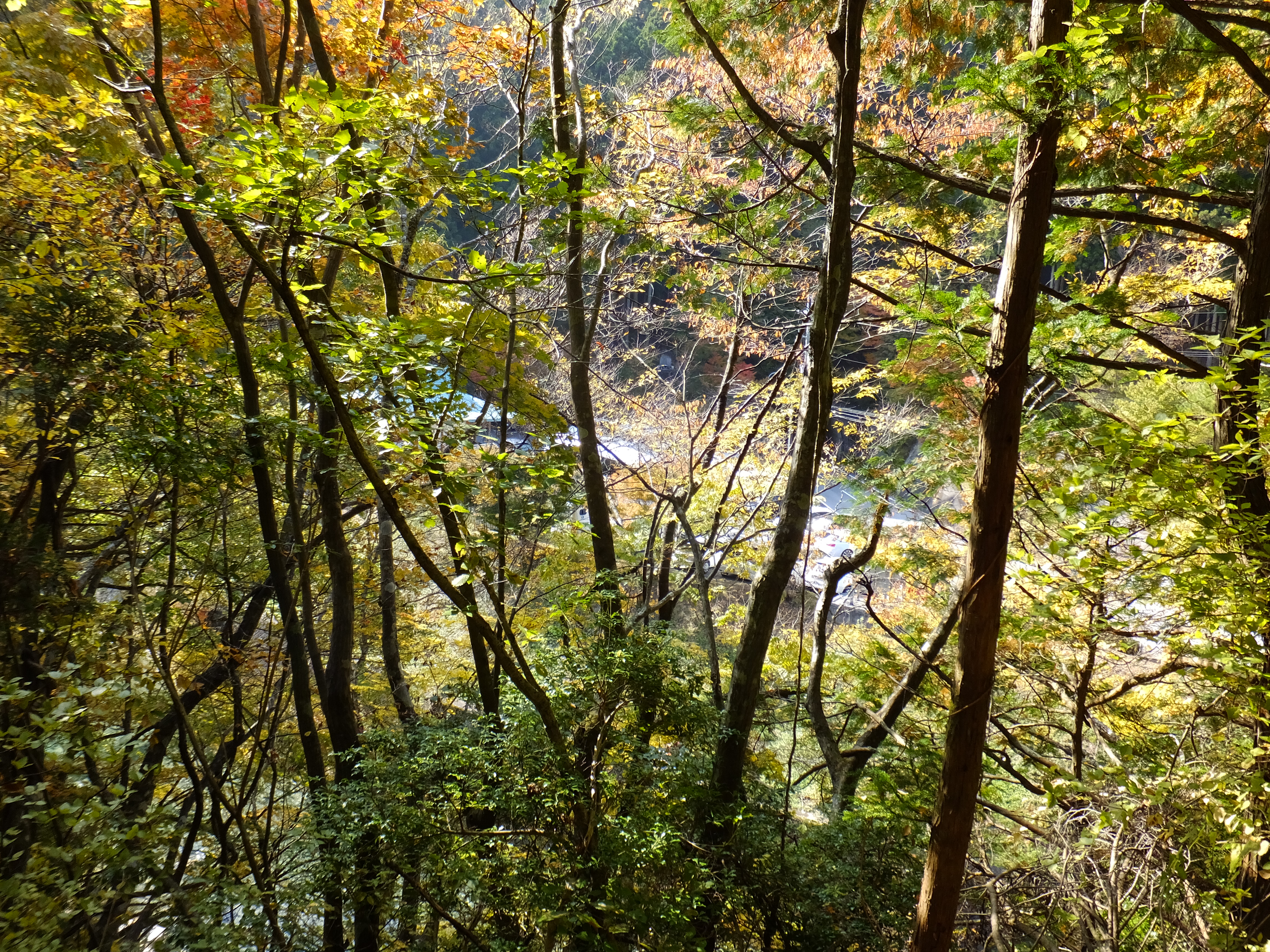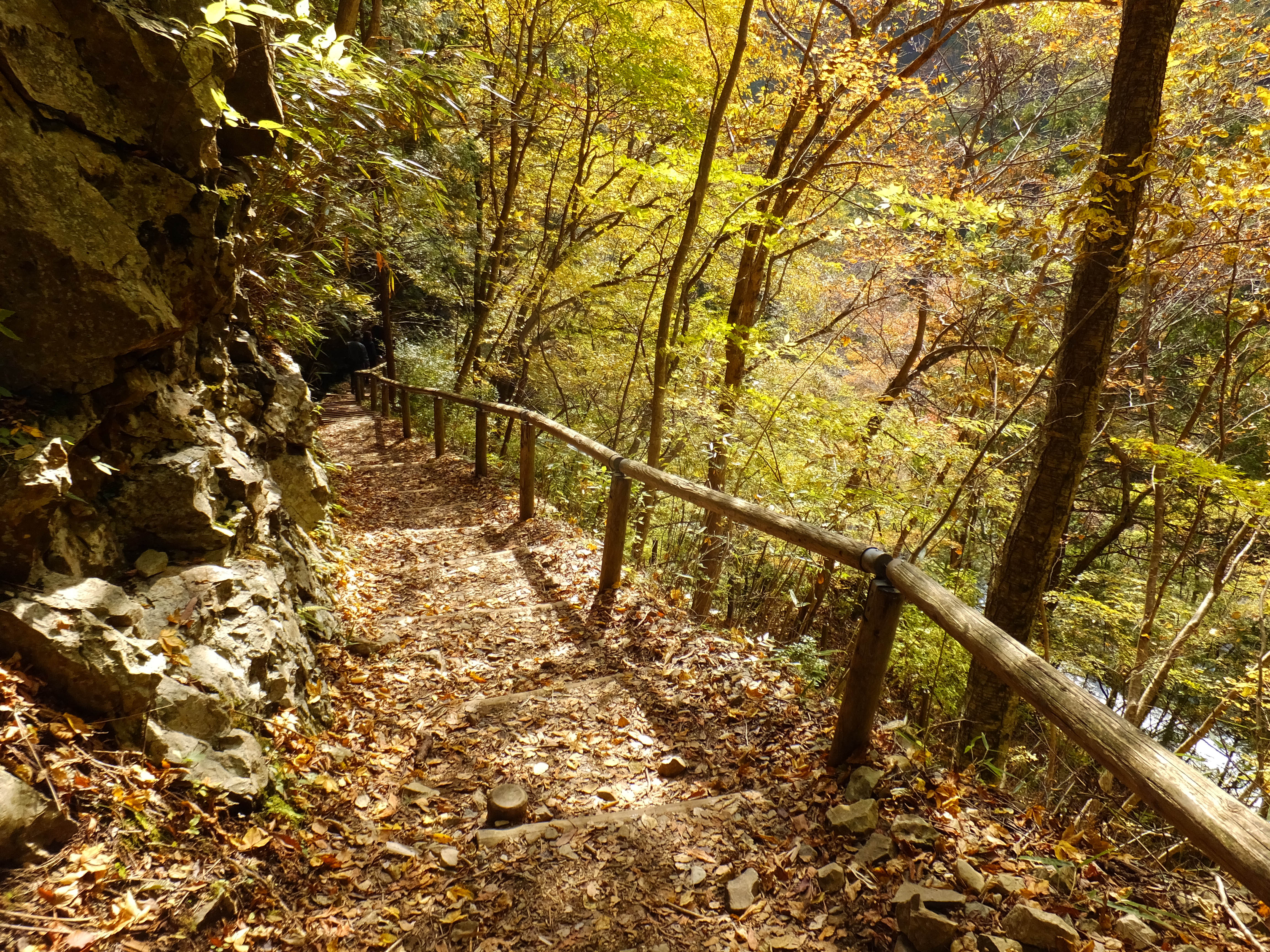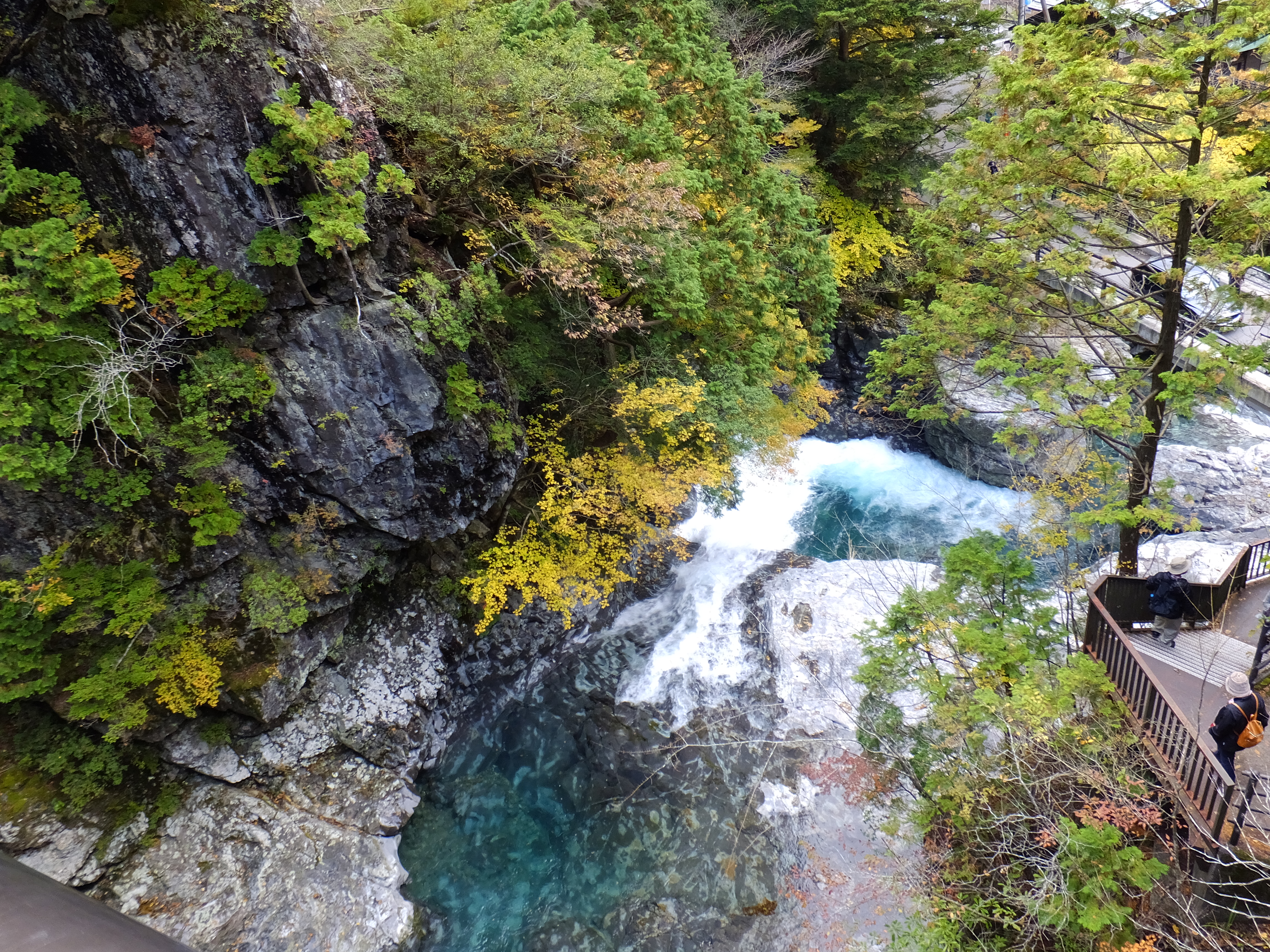 遊歩道入り口から階段になっており、上がっていくとこの風景!上から見ると滝になっていて岩もごつごつしててすごい渓谷!それと紅葉がマッチしてます。