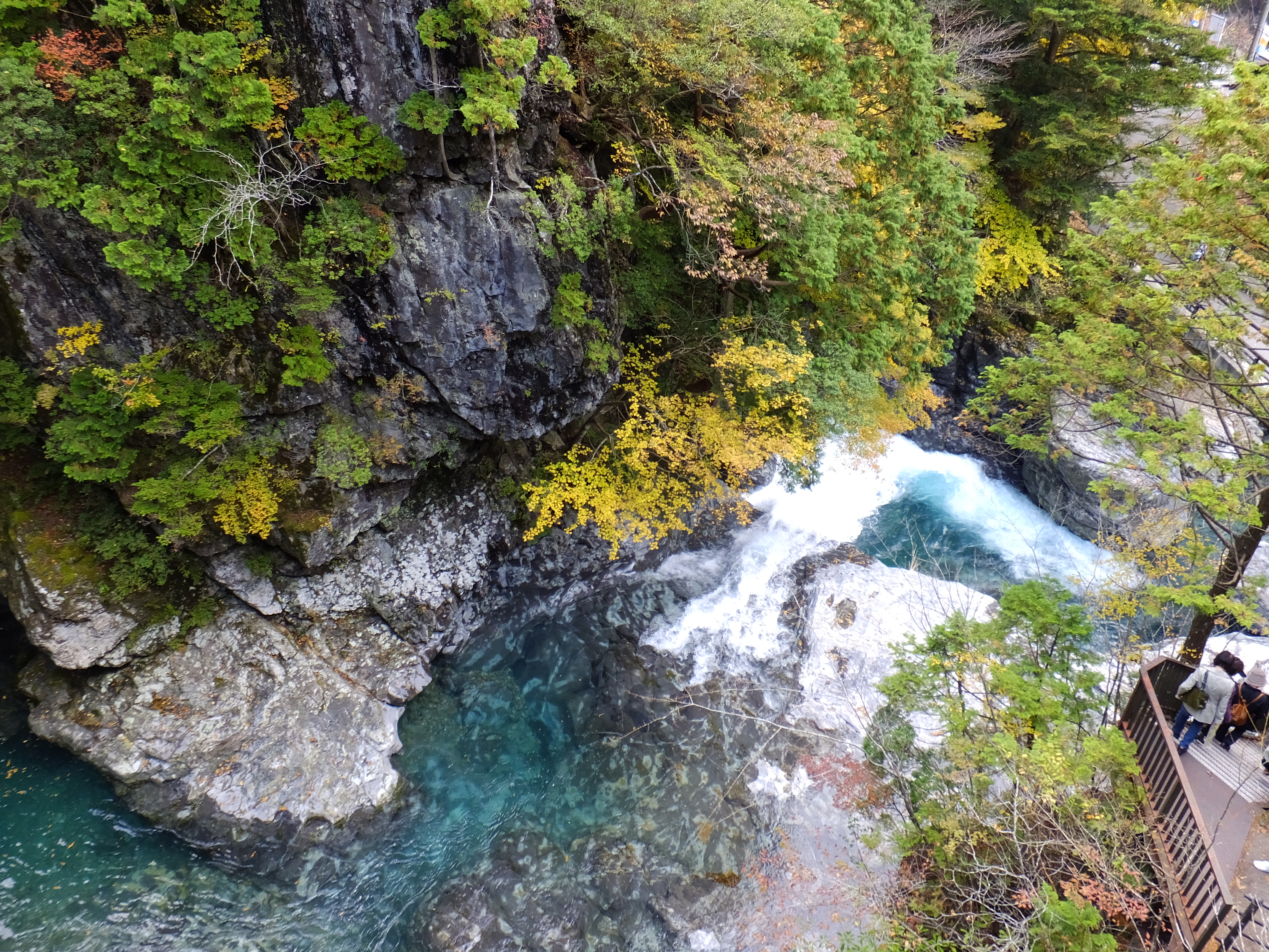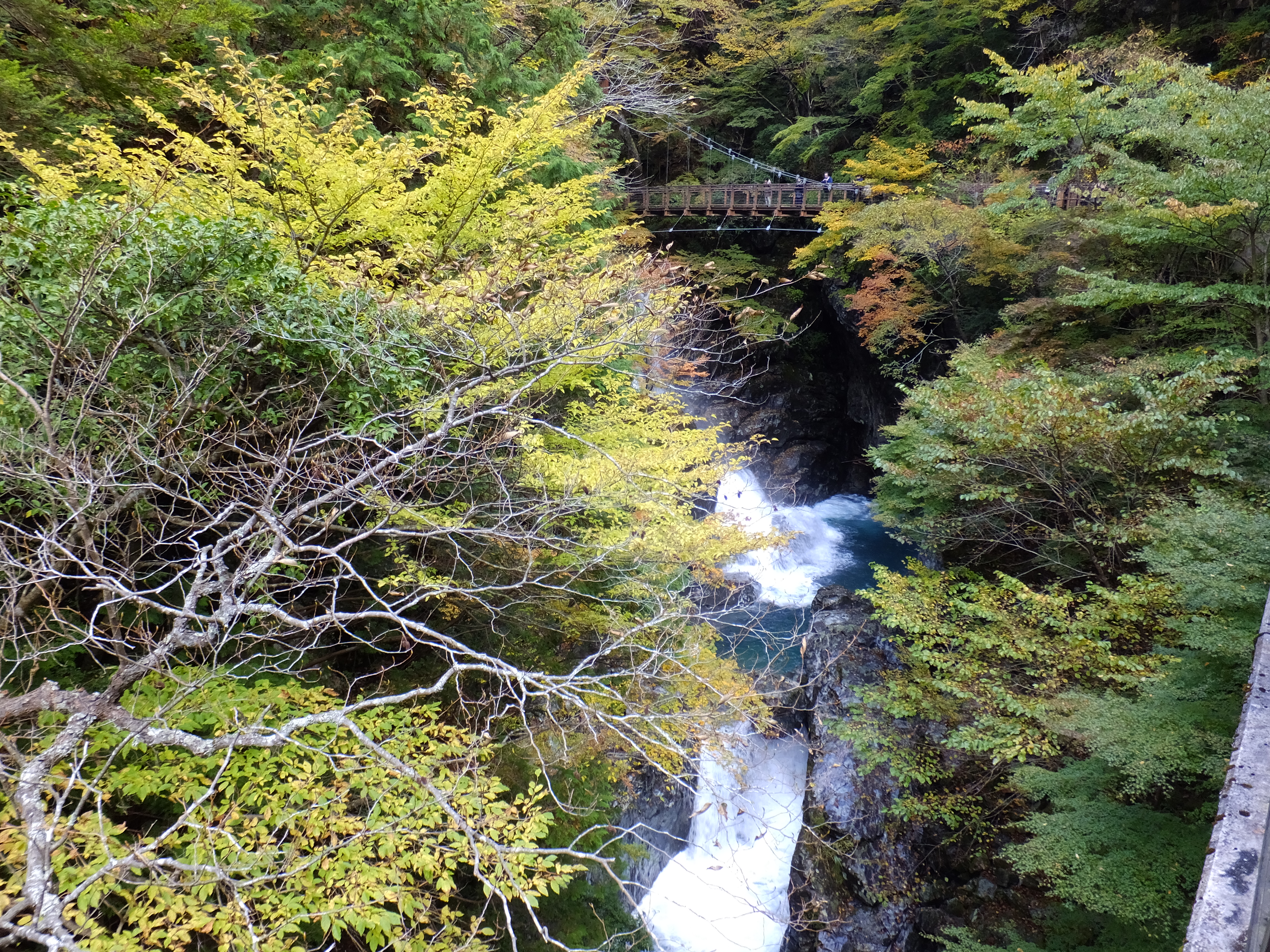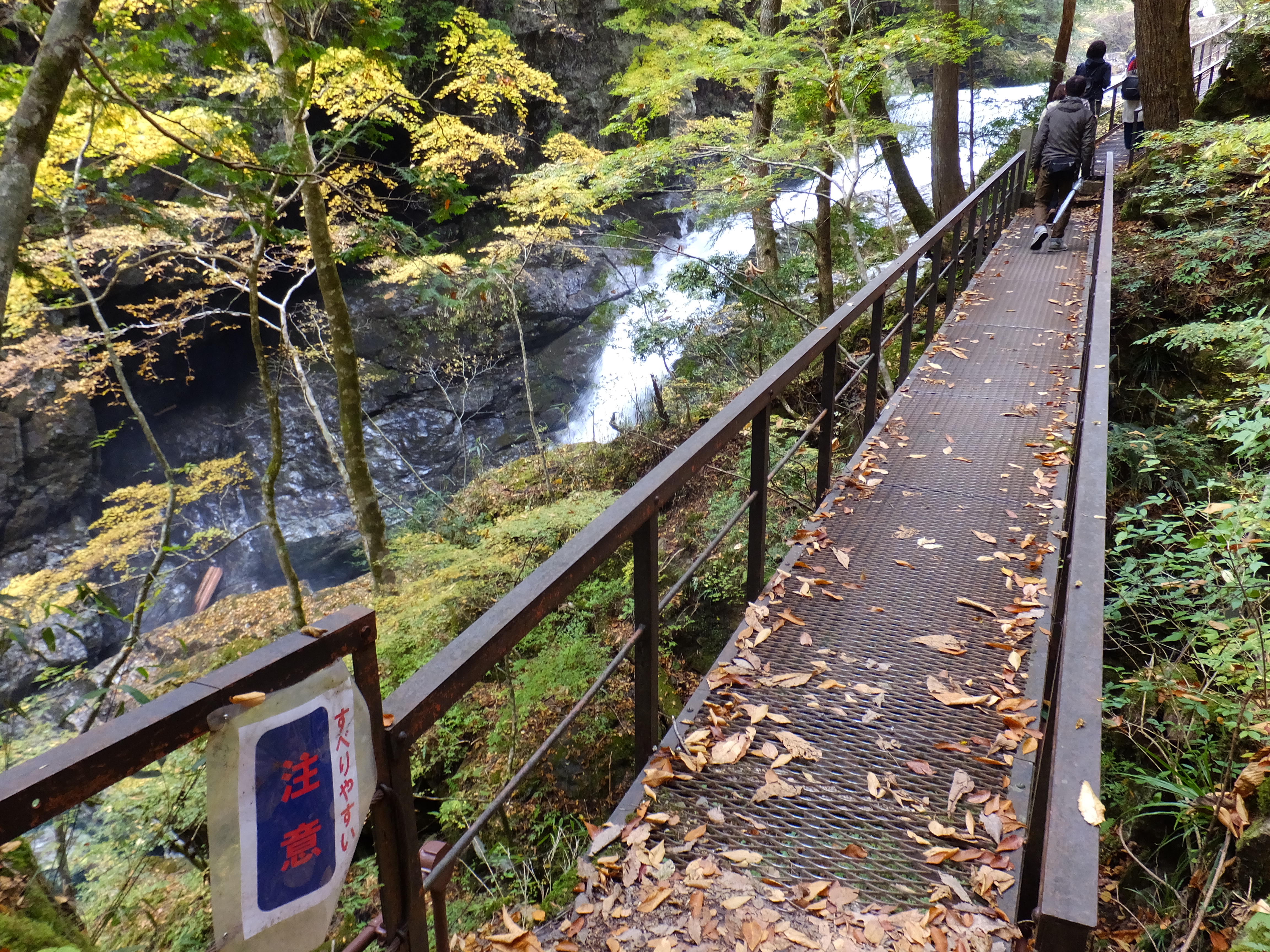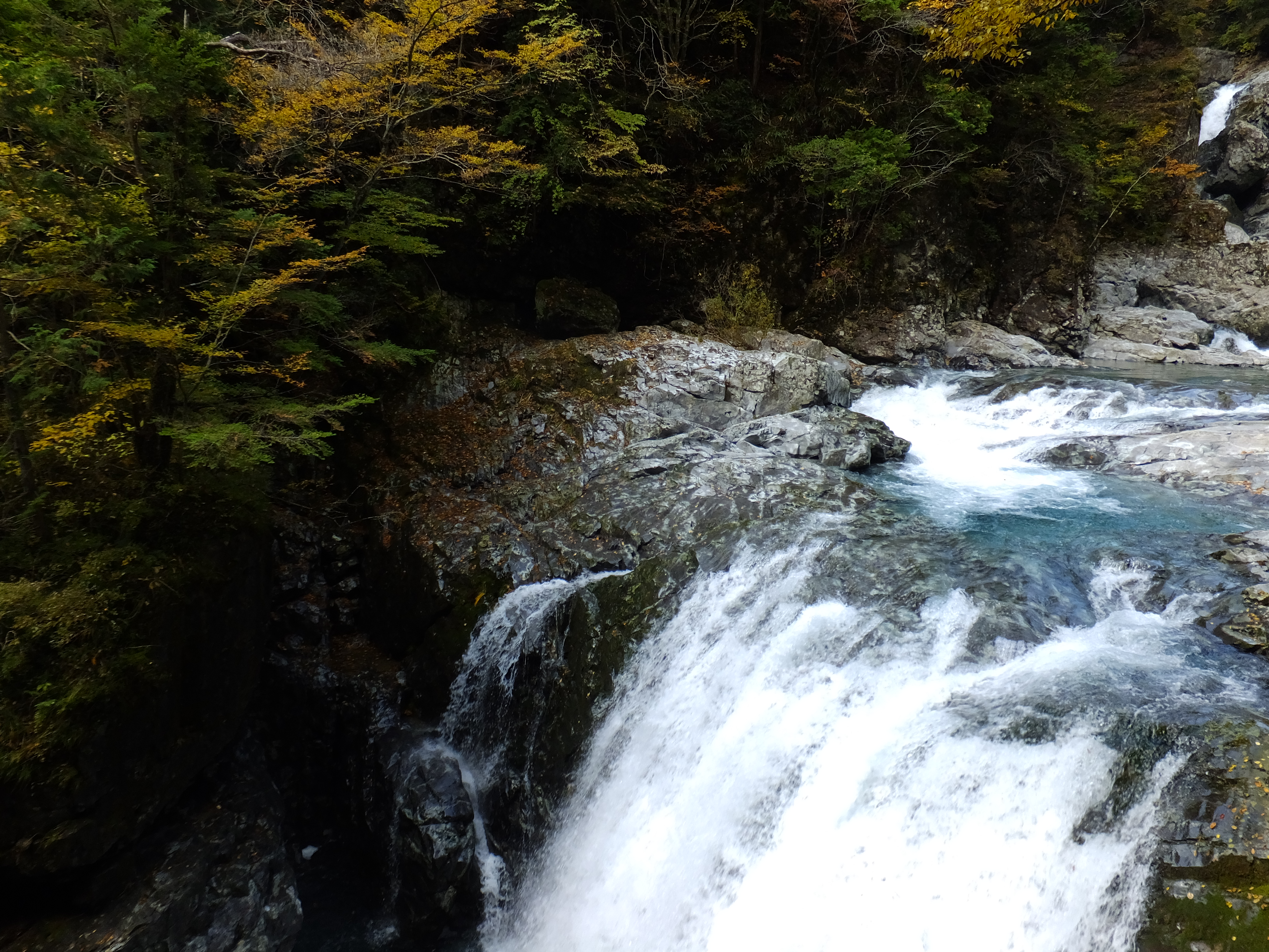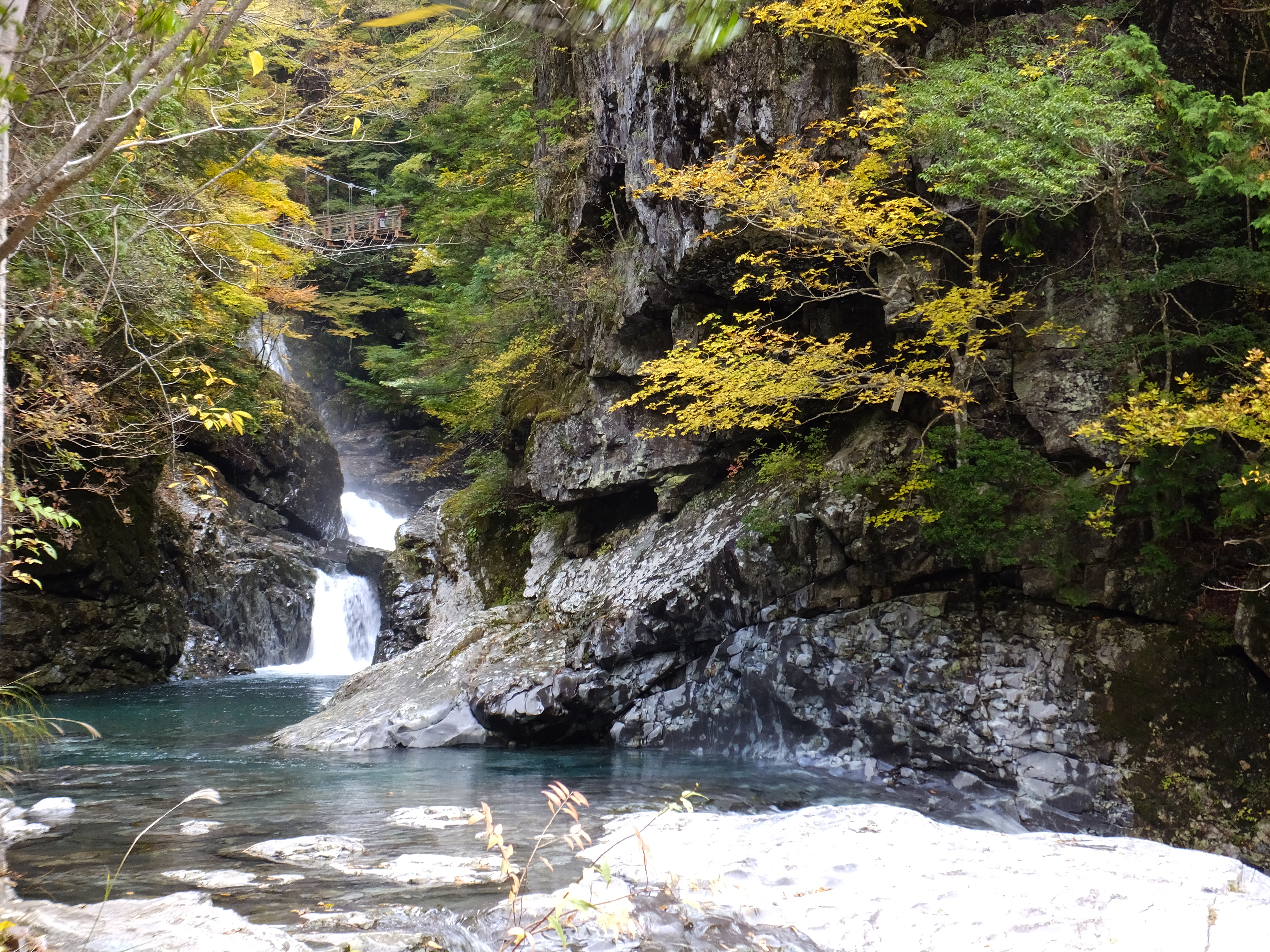 遊歩道入り口から階段になっており、上がっていくとこの風景!上から見ると滝になっていて岩もごつごつしててすごい渓谷!それと紅葉がマッチしてます。