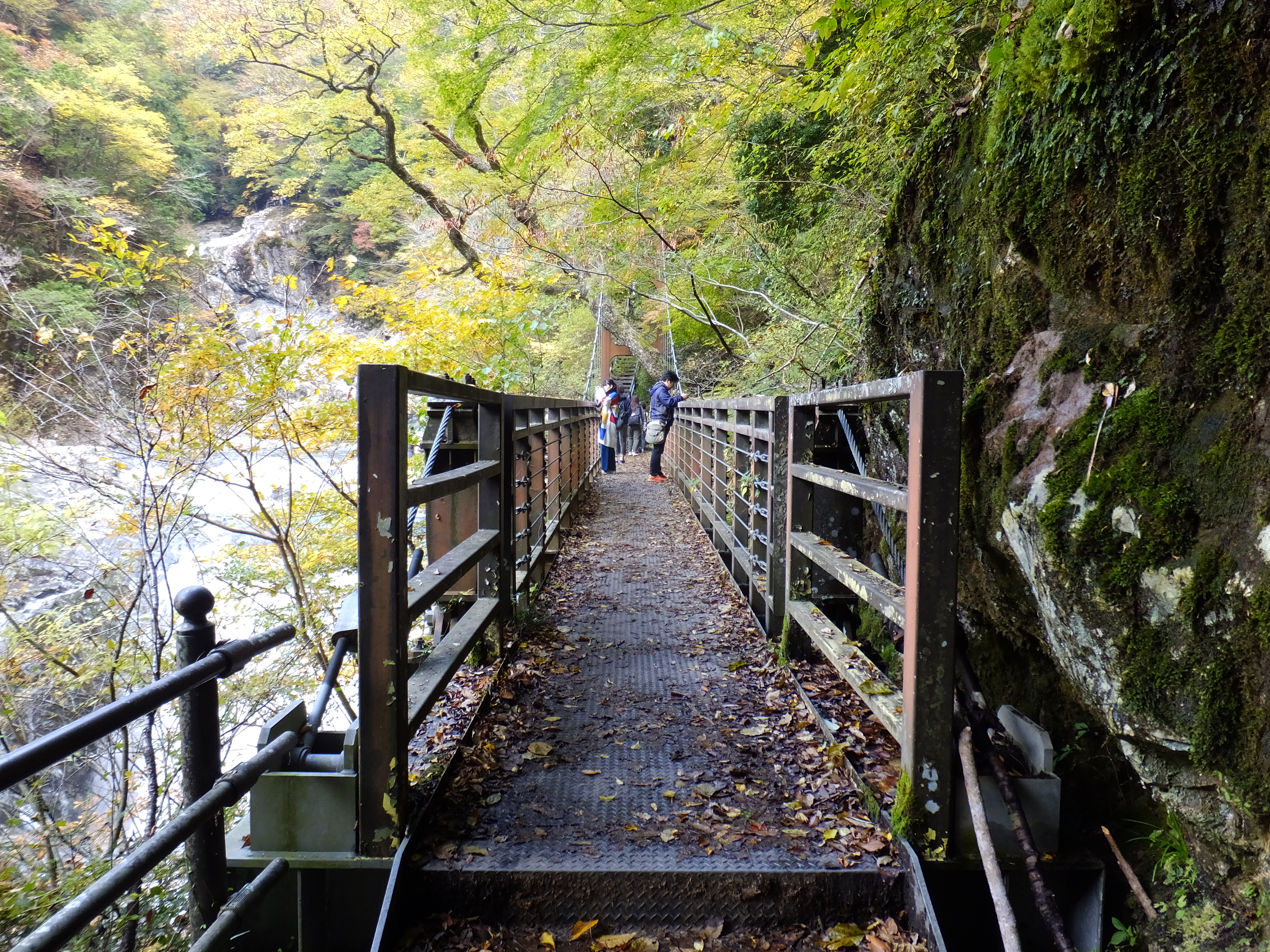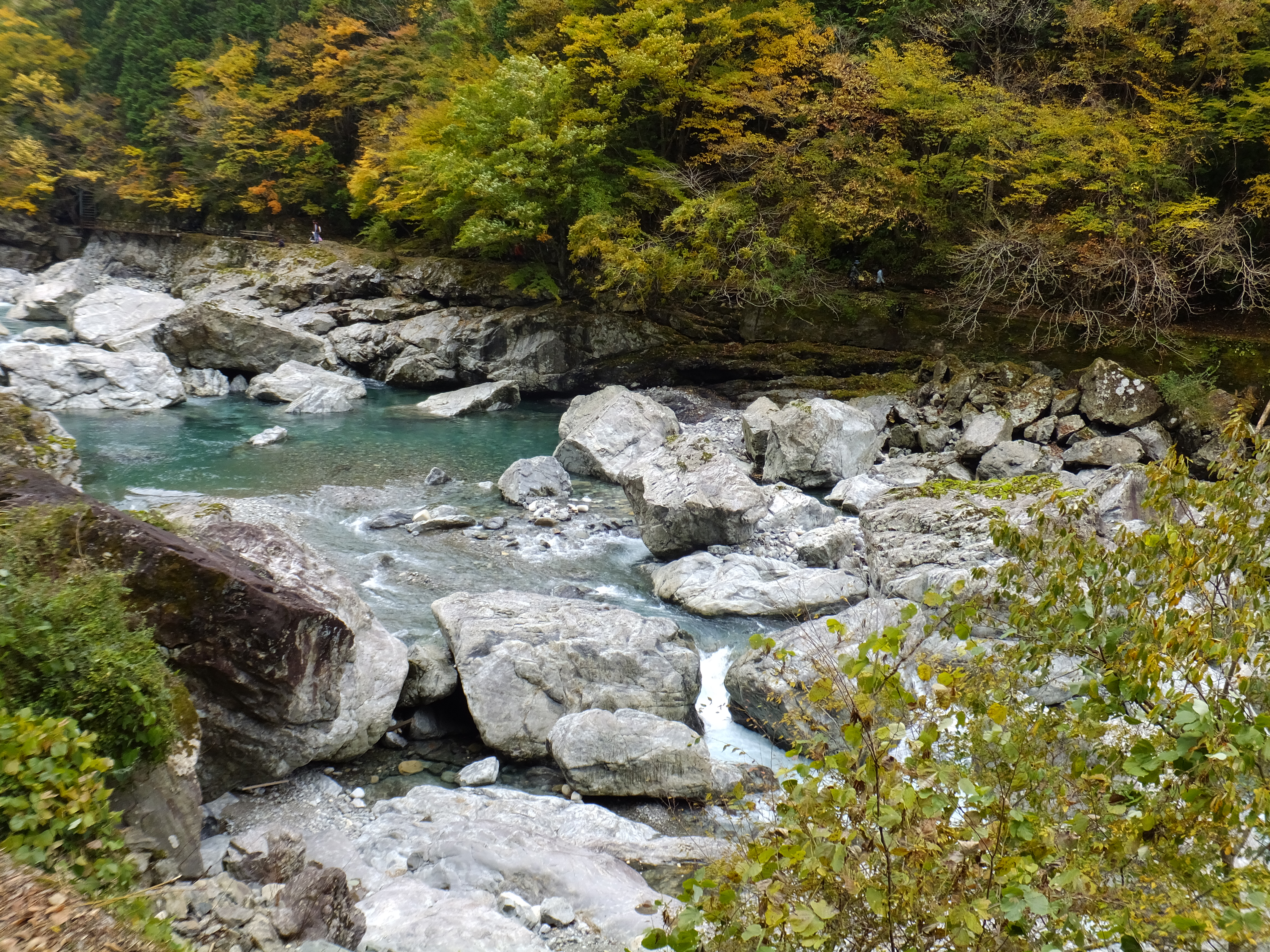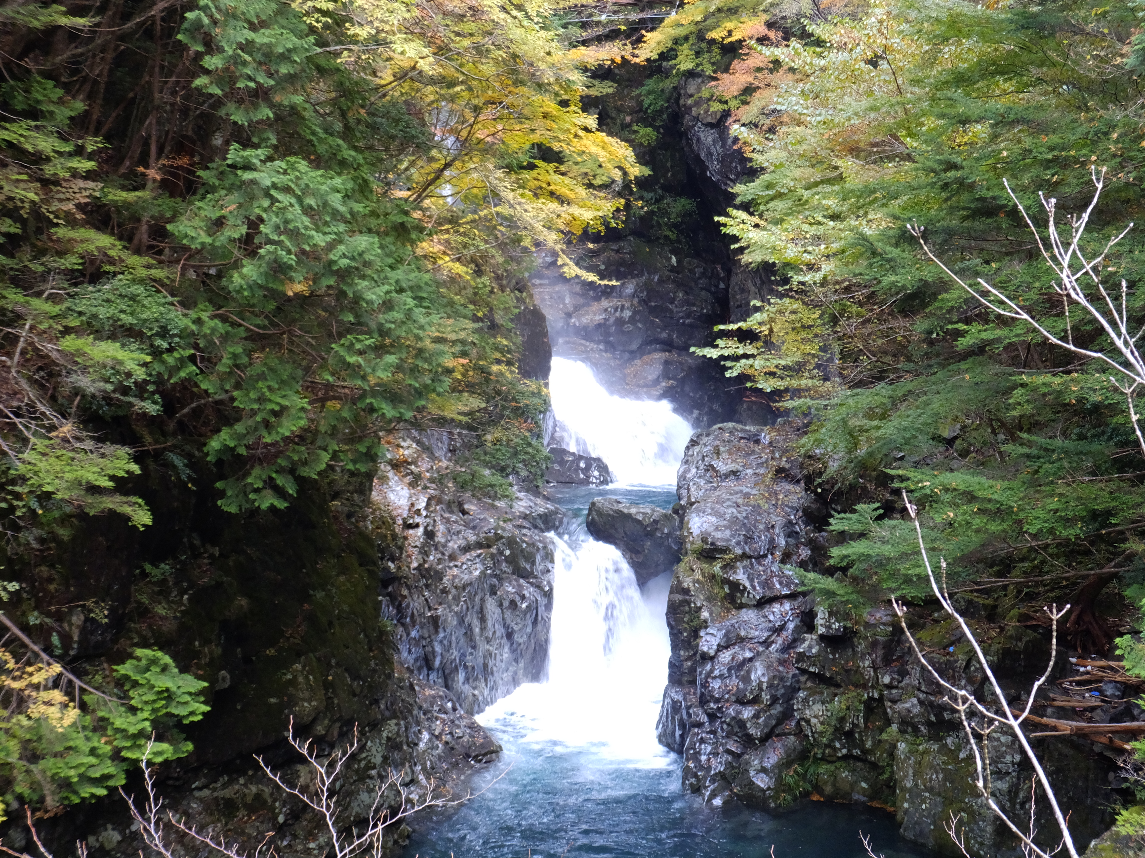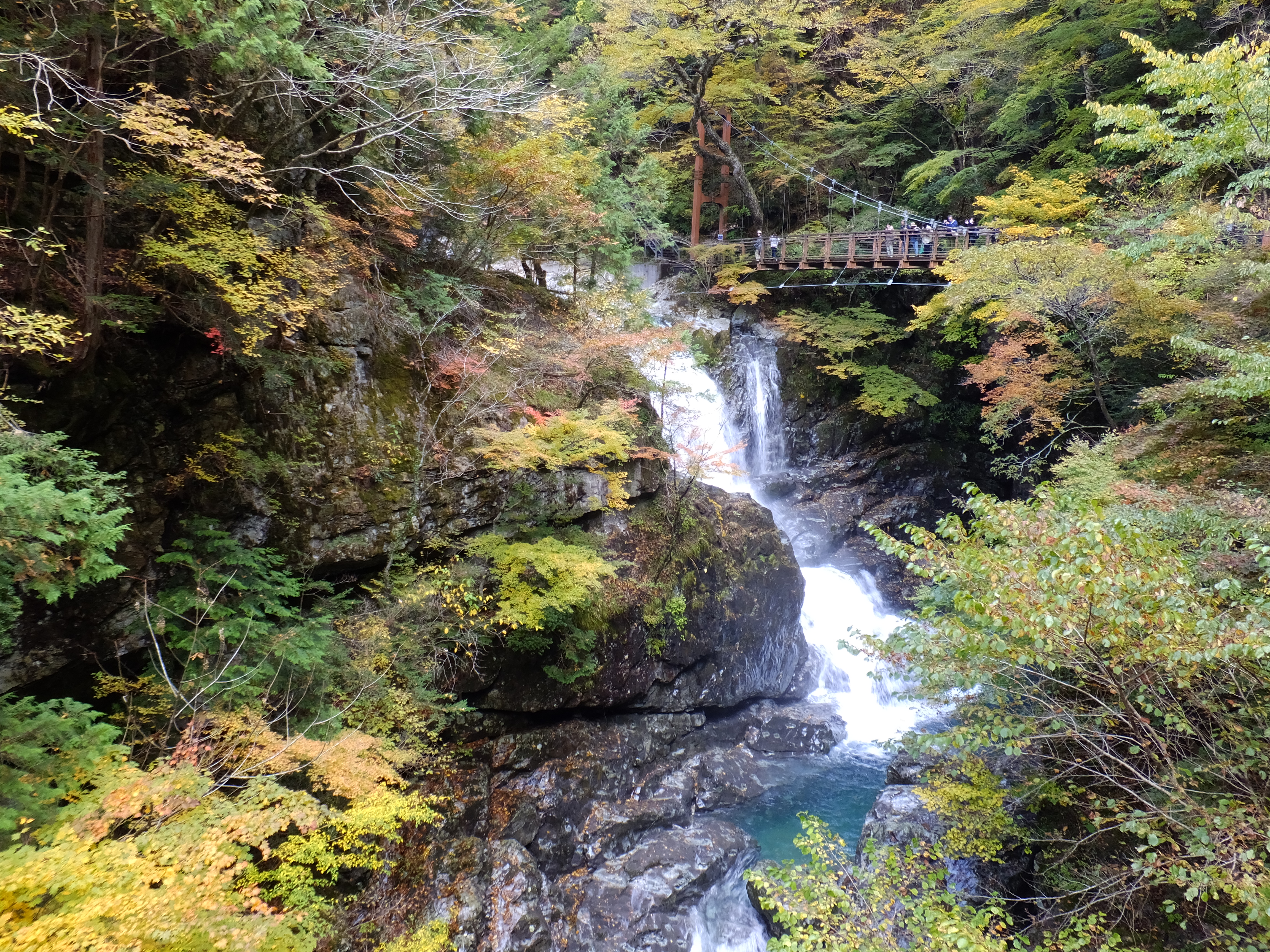 遊歩道入り口から階段になっており、上がっていくとこの風景!上から見ると滝になっていて岩もごつごつしててすごい渓谷!それと紅葉がマッチしてます。