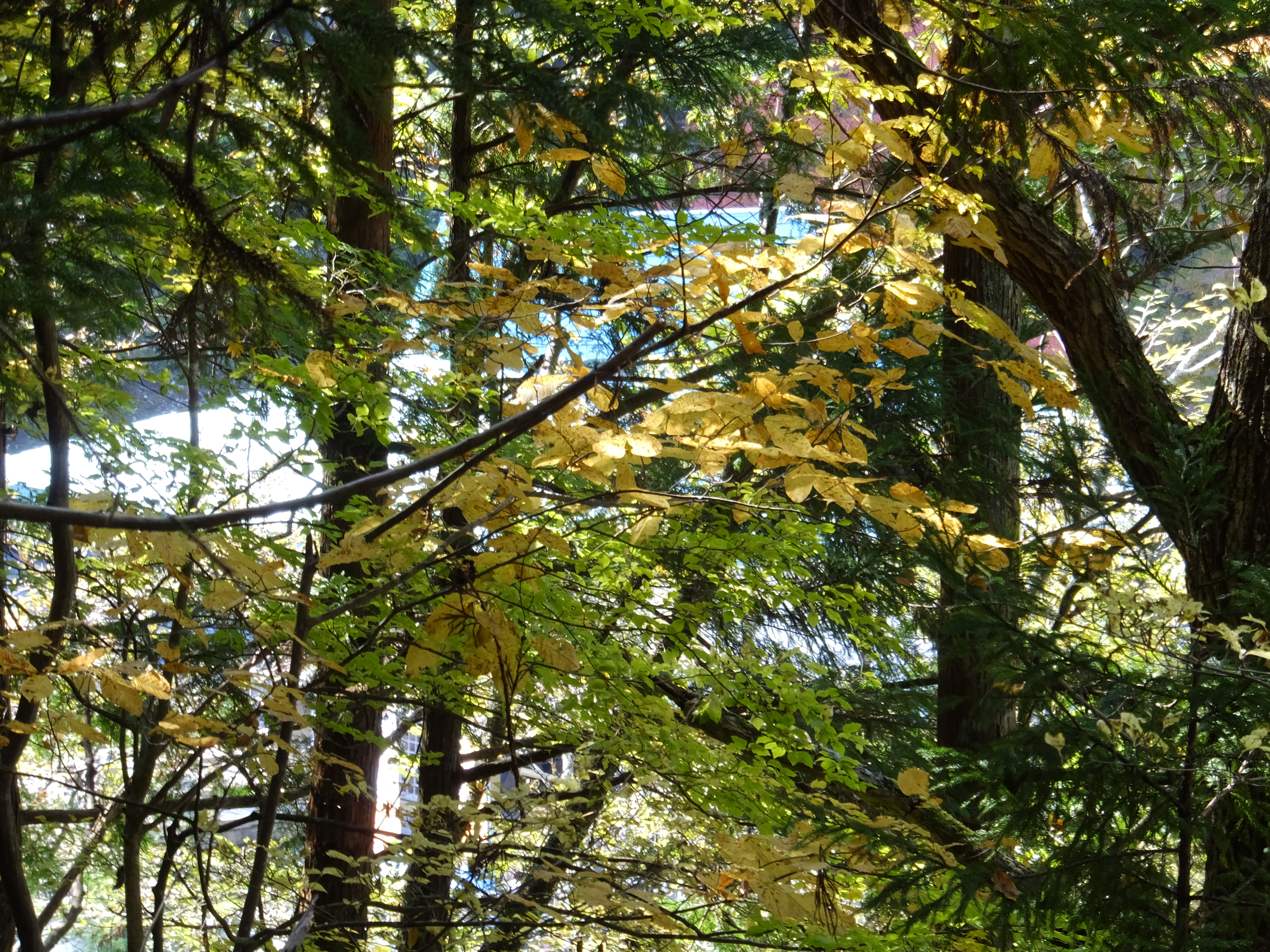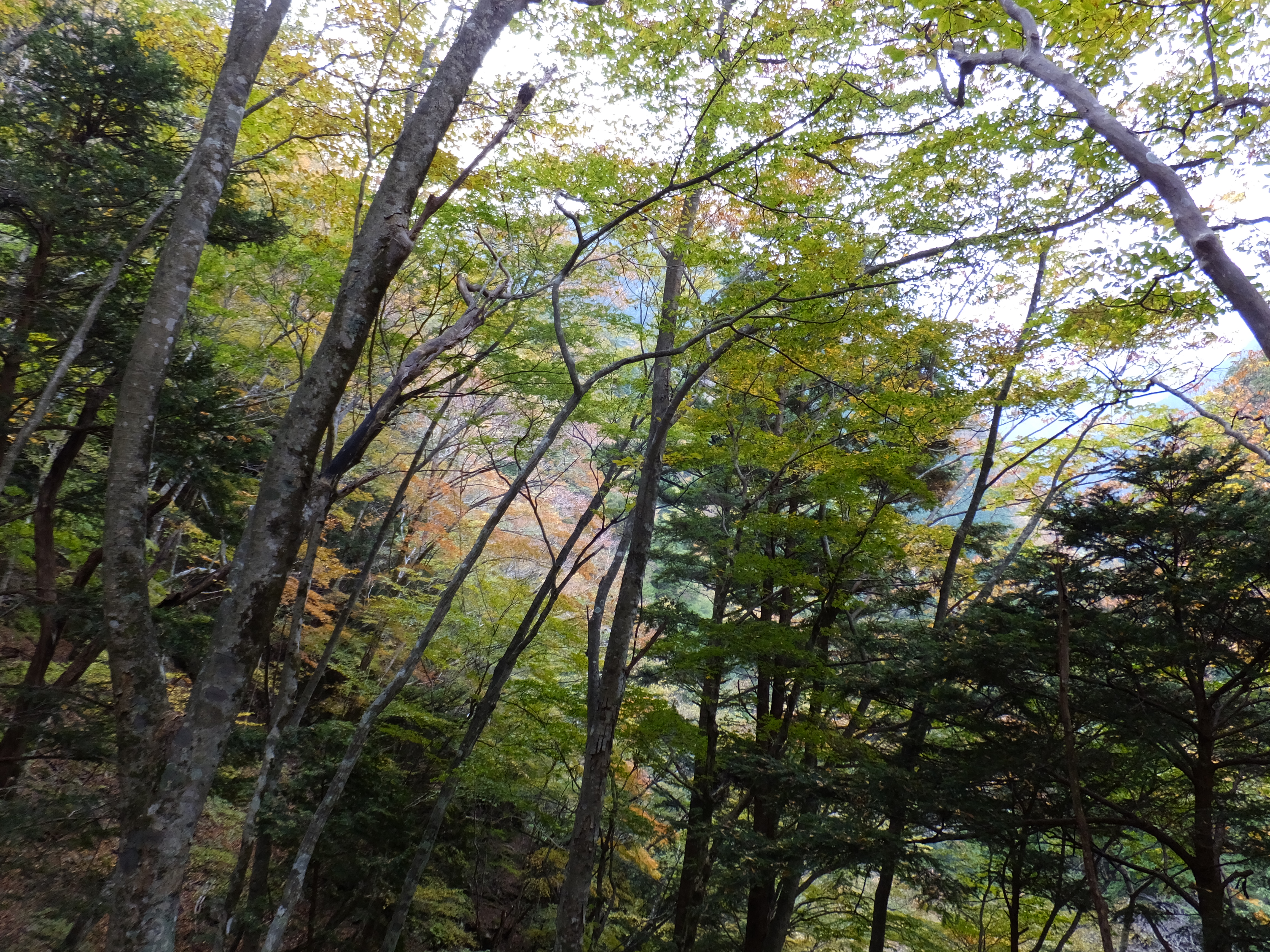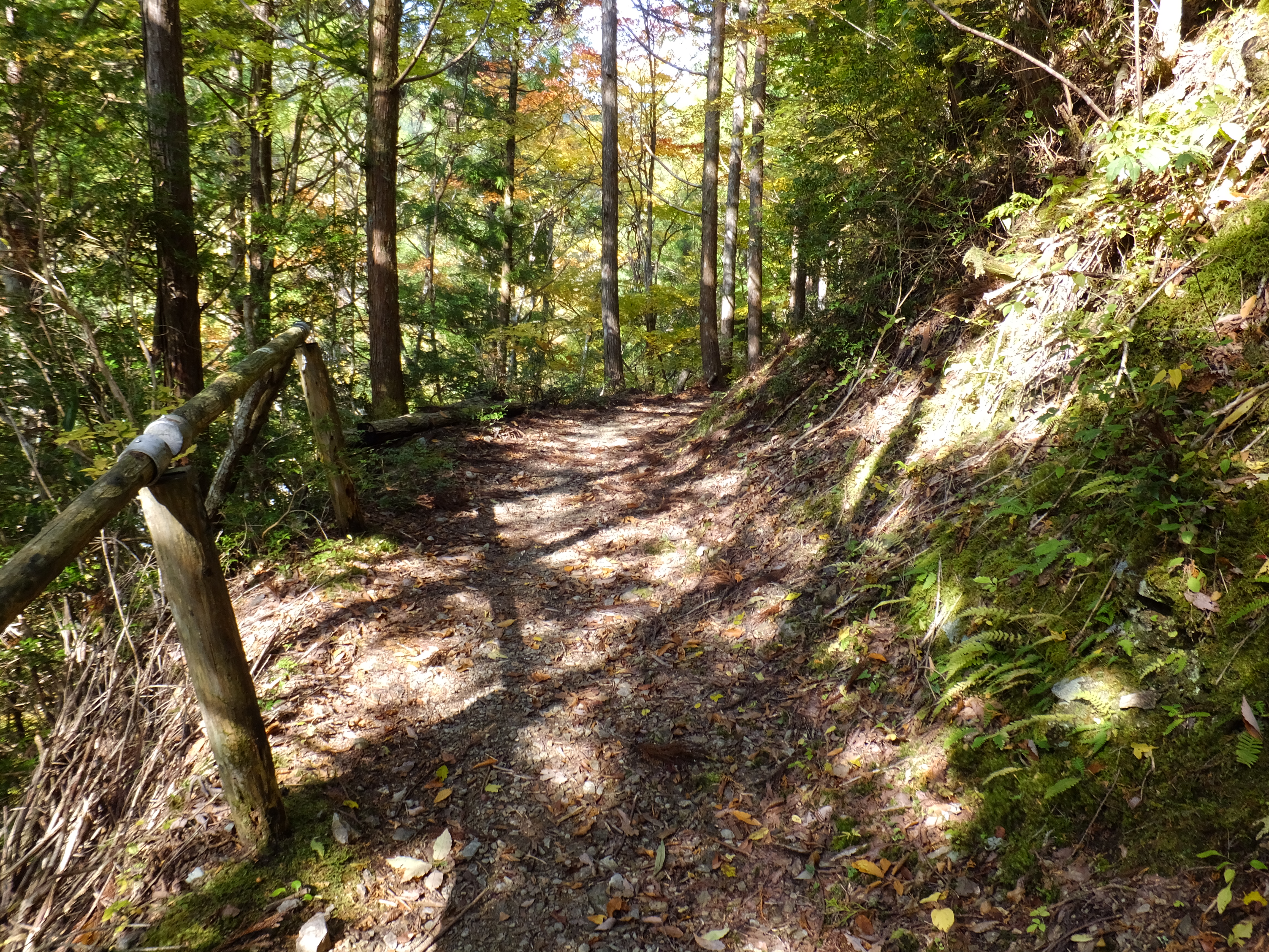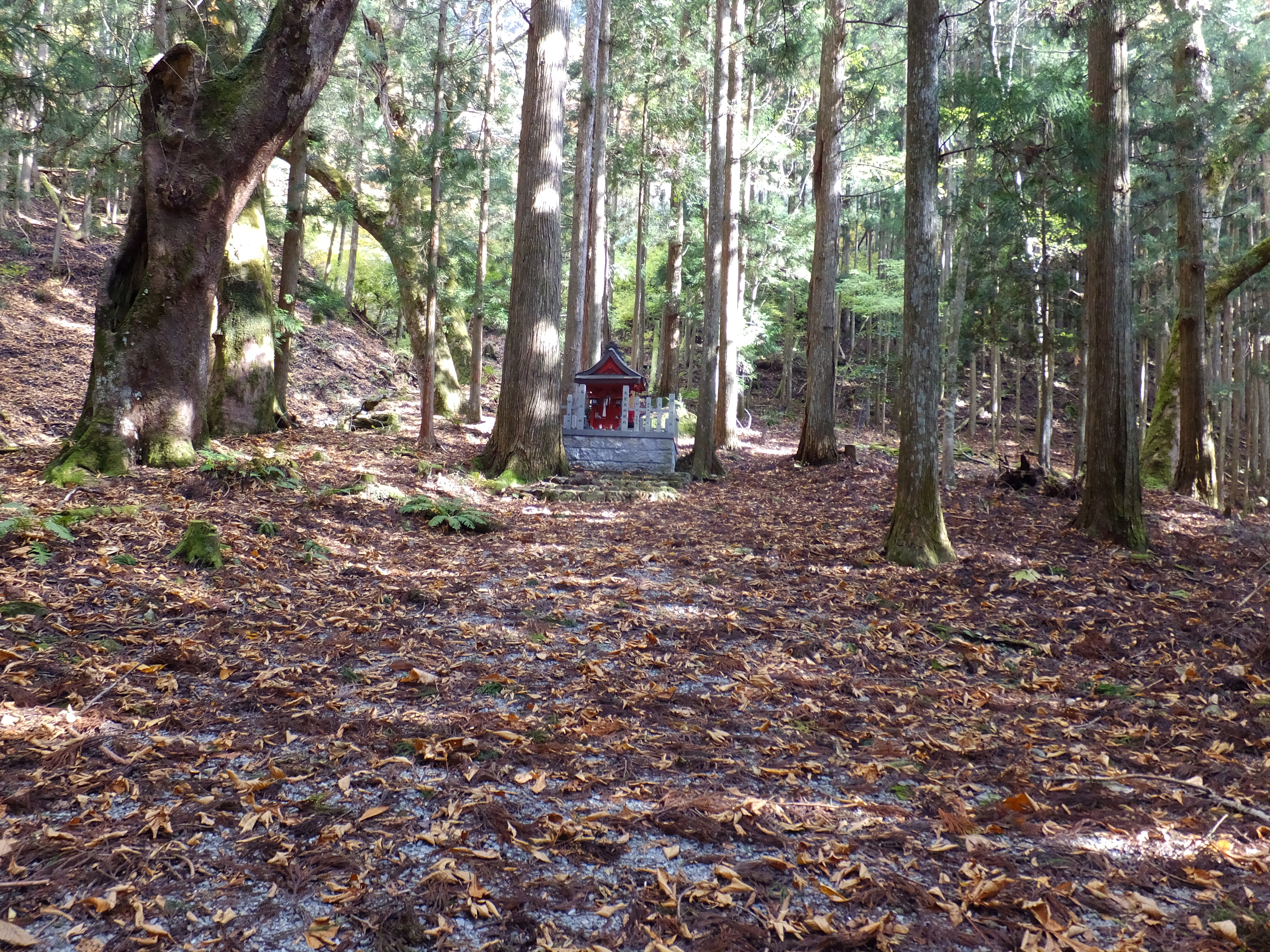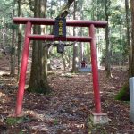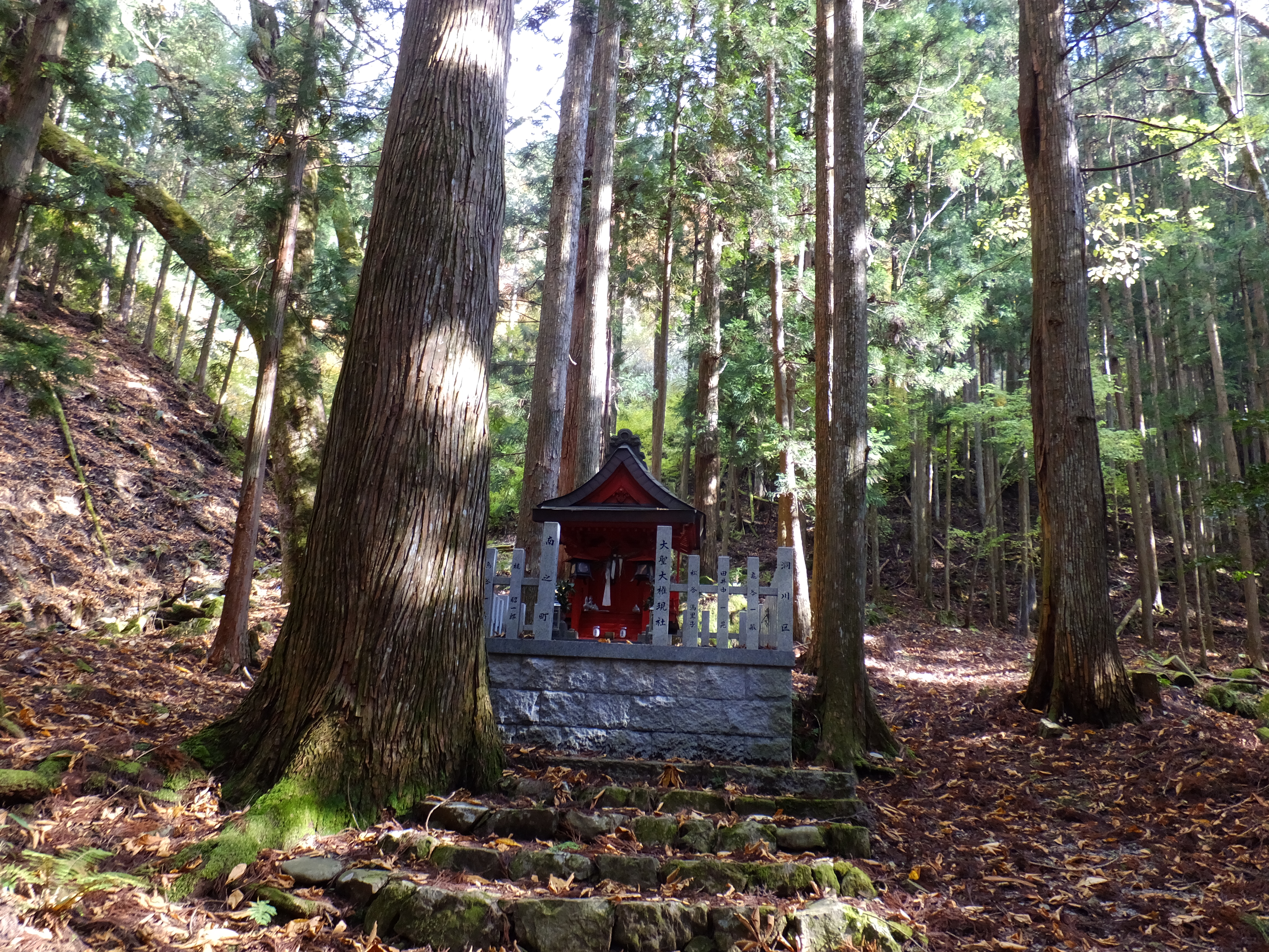 ちょっと道路沿いを歩くとまた遊歩道に入るのですが、ここから紅葉がまったくなしwwずっと杉林を歩きます。歩きやすいところですが紅葉もなくすでに1時間以上歩いていて、友人、、、いや神人との会話もなく無言の時間wいやー疲れてるよねーつき合わせてごめんねー今度ご飯でもおごるからねーと心の中で思っていたら急に鳥居!