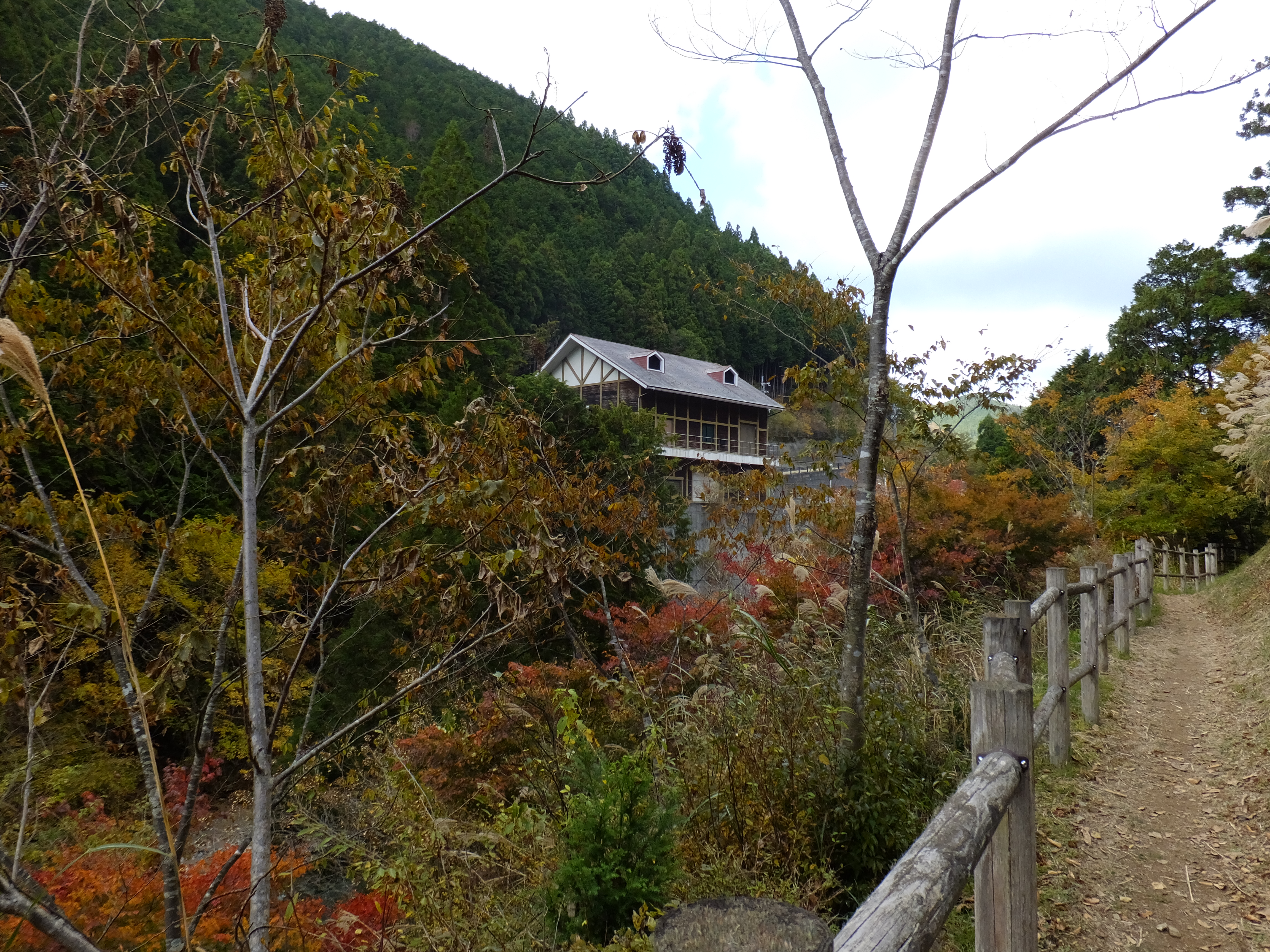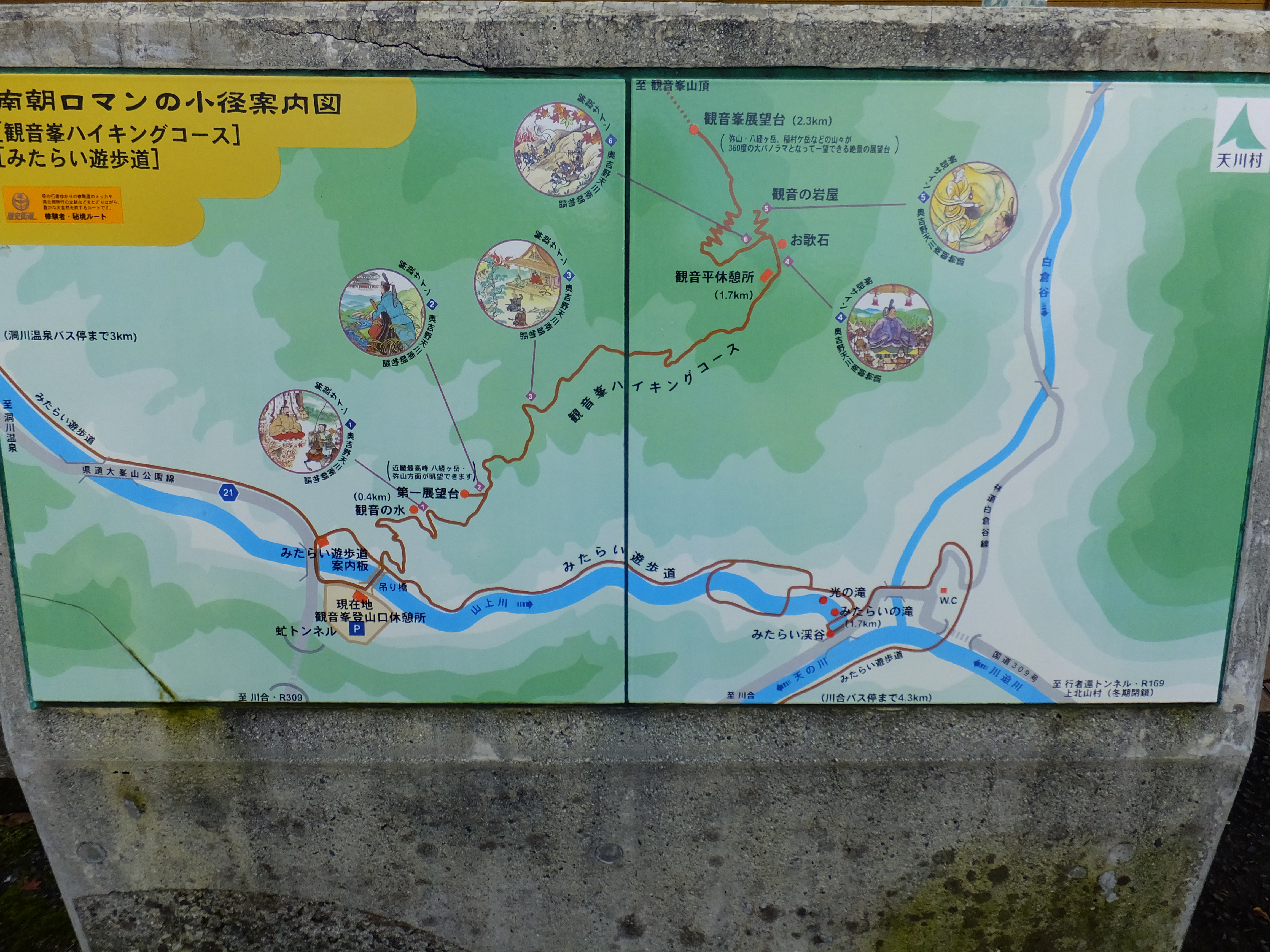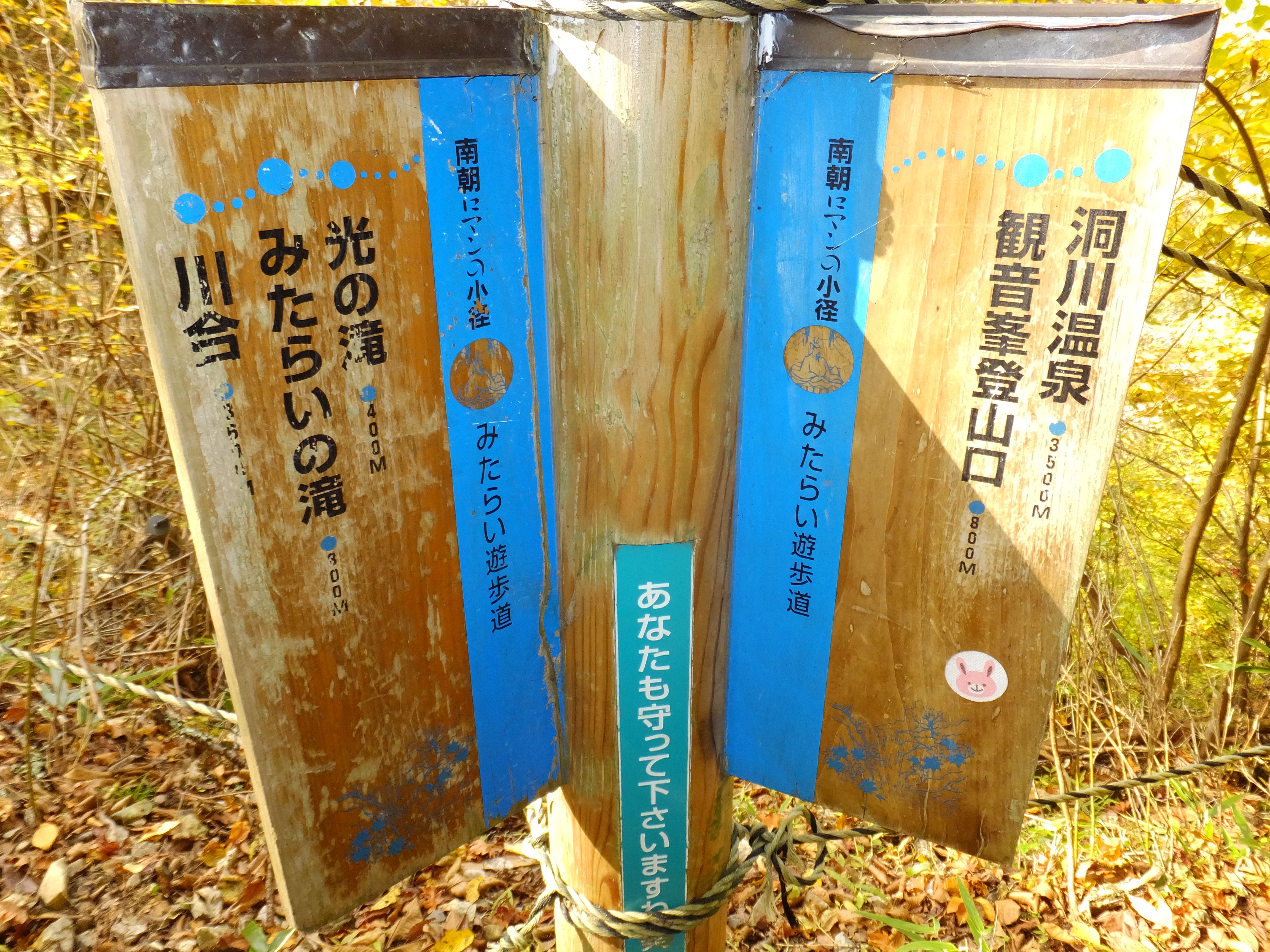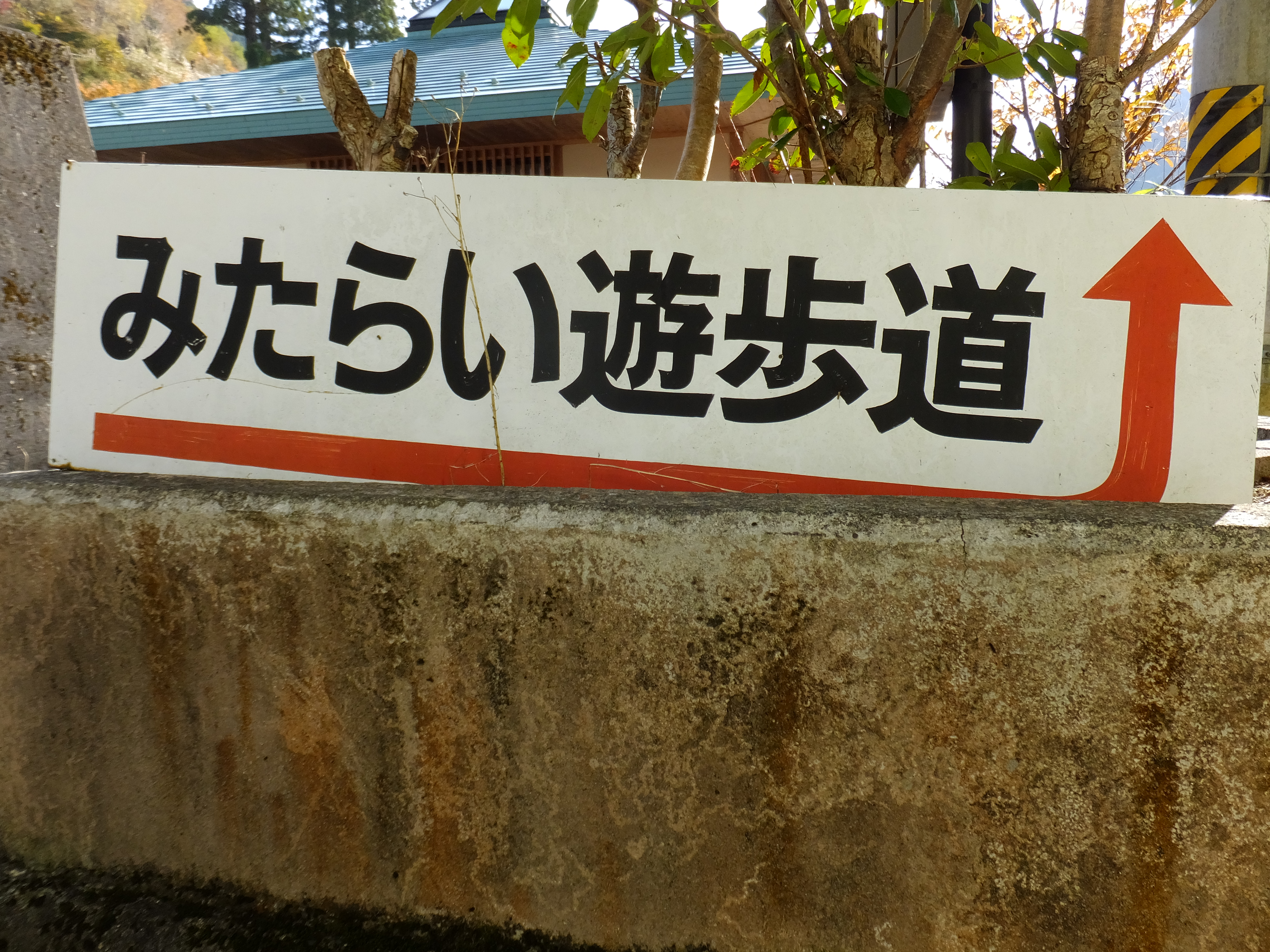 また今度来たいと思います。この後なぜか遊歩道が途中で切れて、あれーーって友達とも近くを歩いていた人とも話してたのですが、じつは一度道路沿いに出るみたいなんです。道路に出てみると進行方向と逆の方に何やら建物が。その前にこんな看板あったのですが、このまま真っすぐだねーって友達と言ってたのですが、こっちから言ったらよかったのですか?どうなのみたらい渓谷さん!