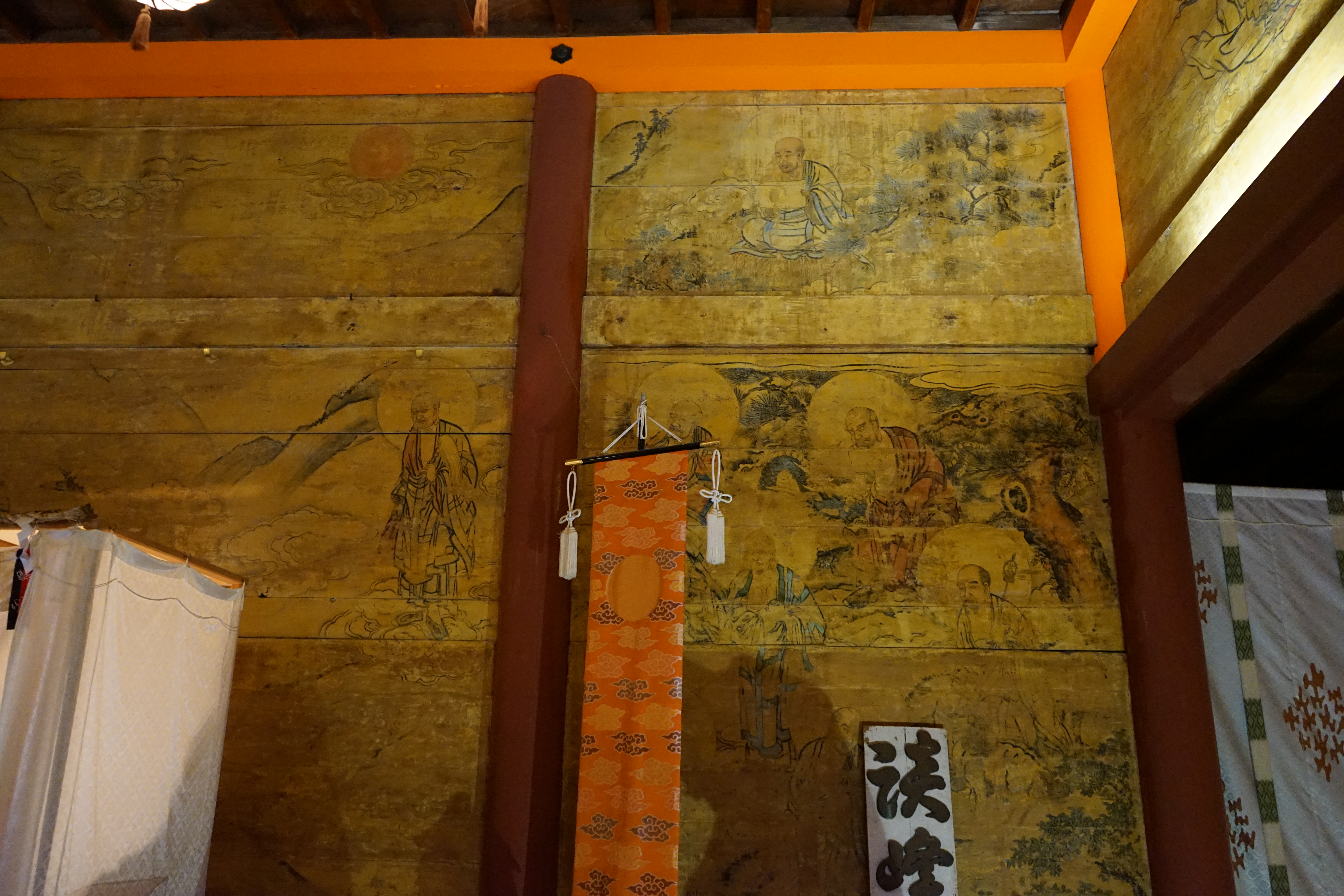 福禄寿大神の反対側には信廟拝所があります、信廟拝所は定慧和尚が白鳳8年(679年)に父・藤原鎌足公供養のため創建した妙楽寺の講堂です。現存するのは江戸時代に再建されたものですが、中の壁には天女が描かれていたりタイムスリップした気がします。