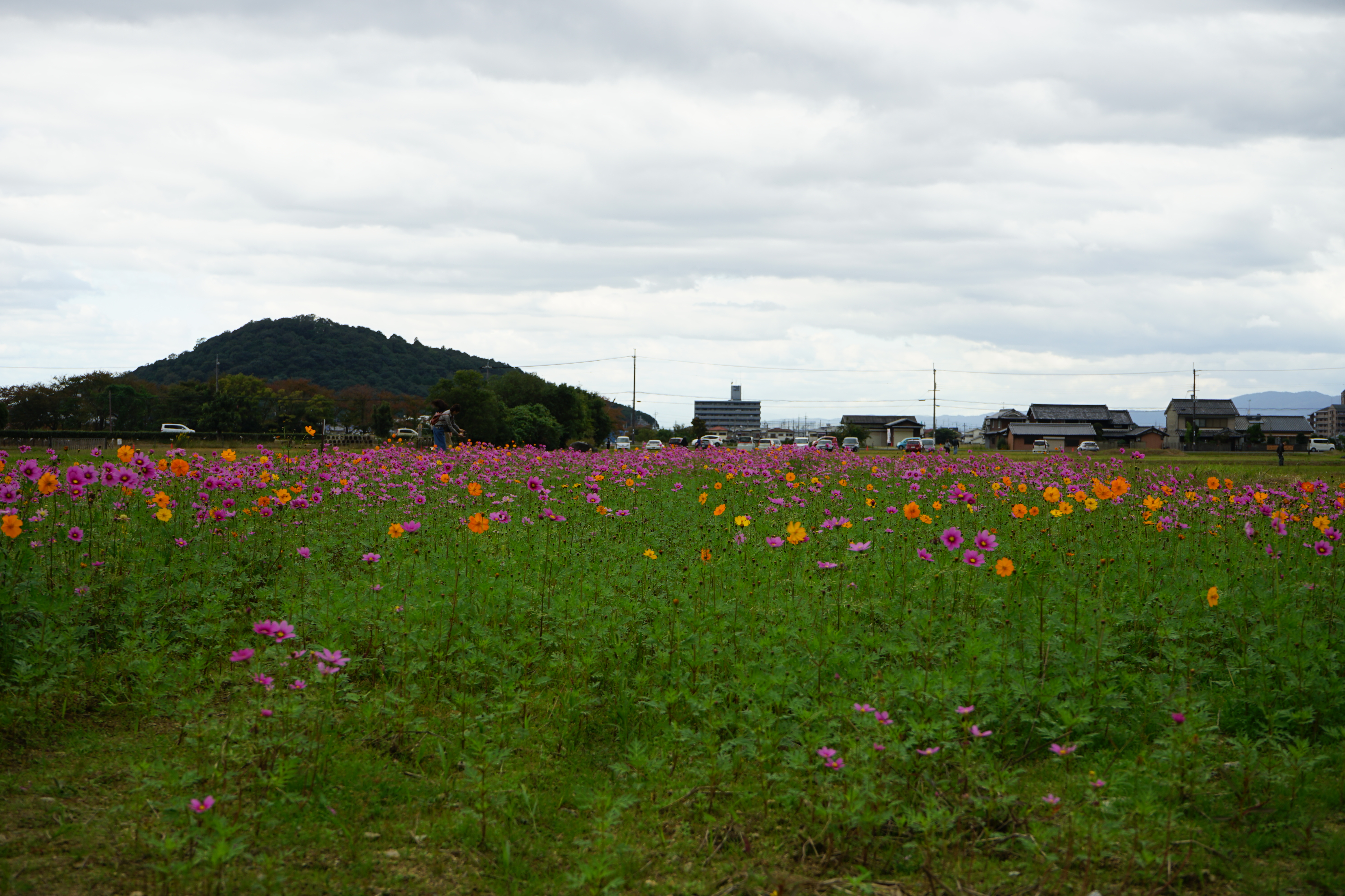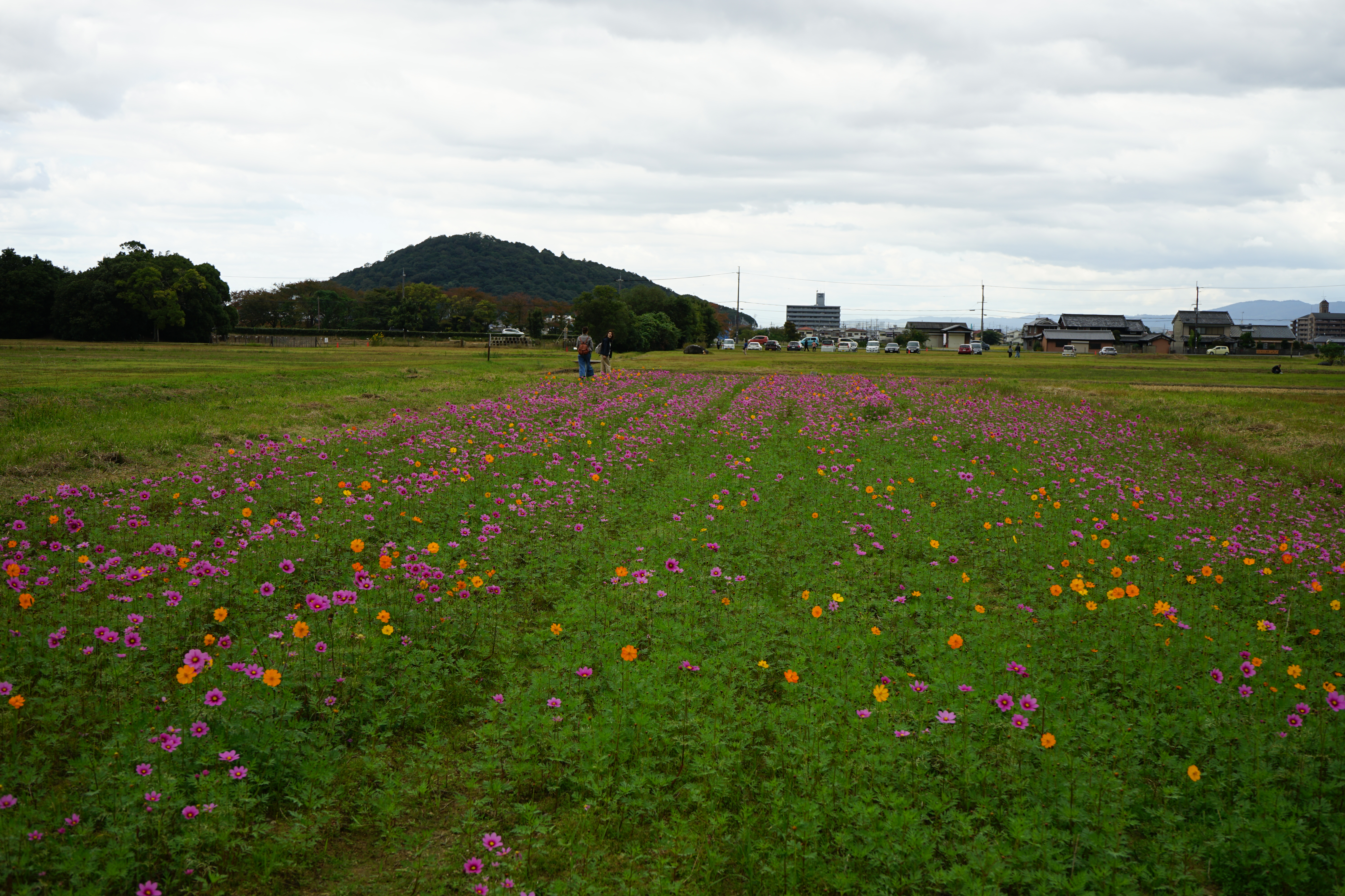この風景は、1300年前から変わらないんです!これすごくないすか?写真では伝わらないかもしれないですが、これ本当にすごい景色なんです。橿原市は高い建物も少ないので、この景色はこれからも変わらないでほしい風景です。でも!!今回は!!!コスモス!!!!!