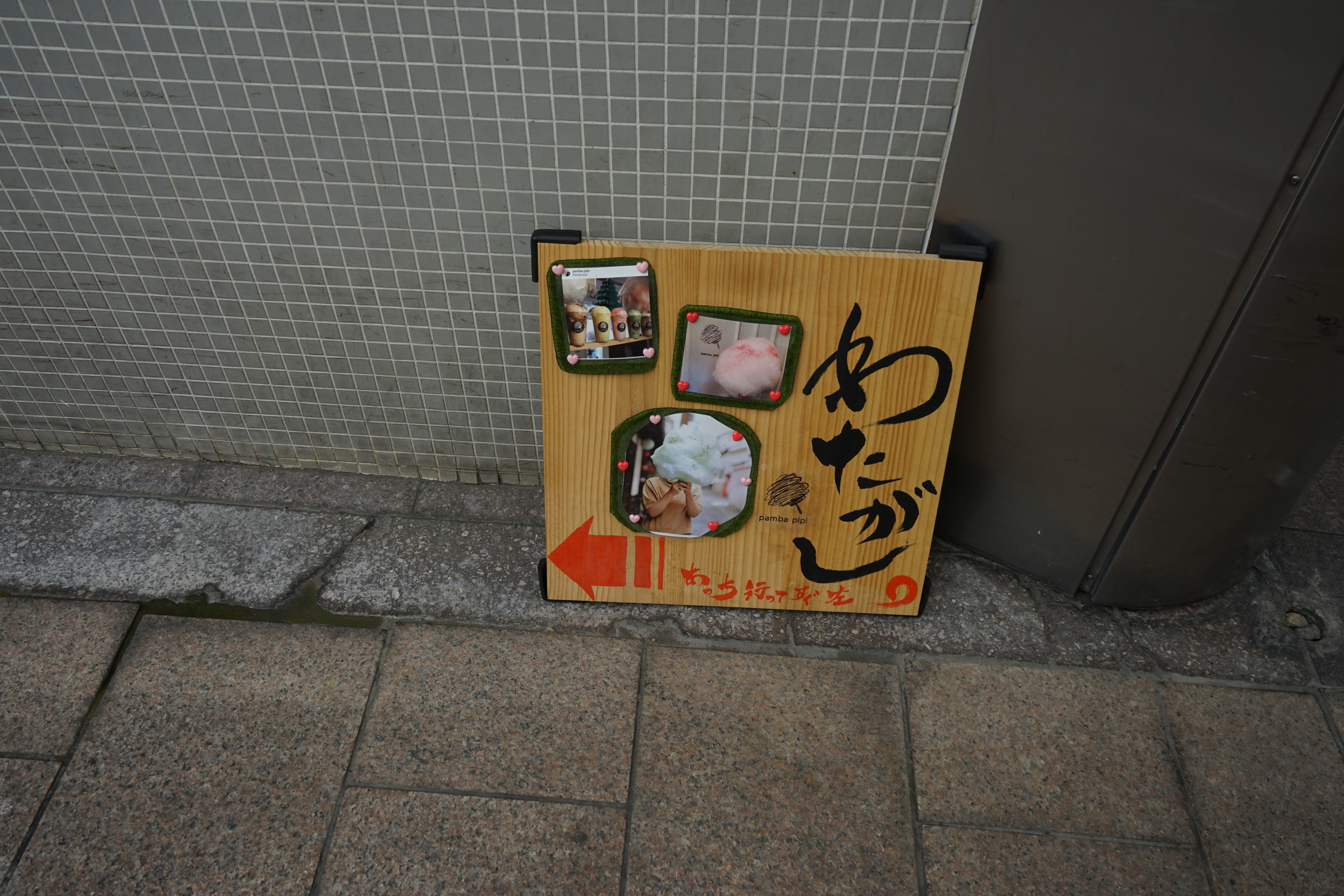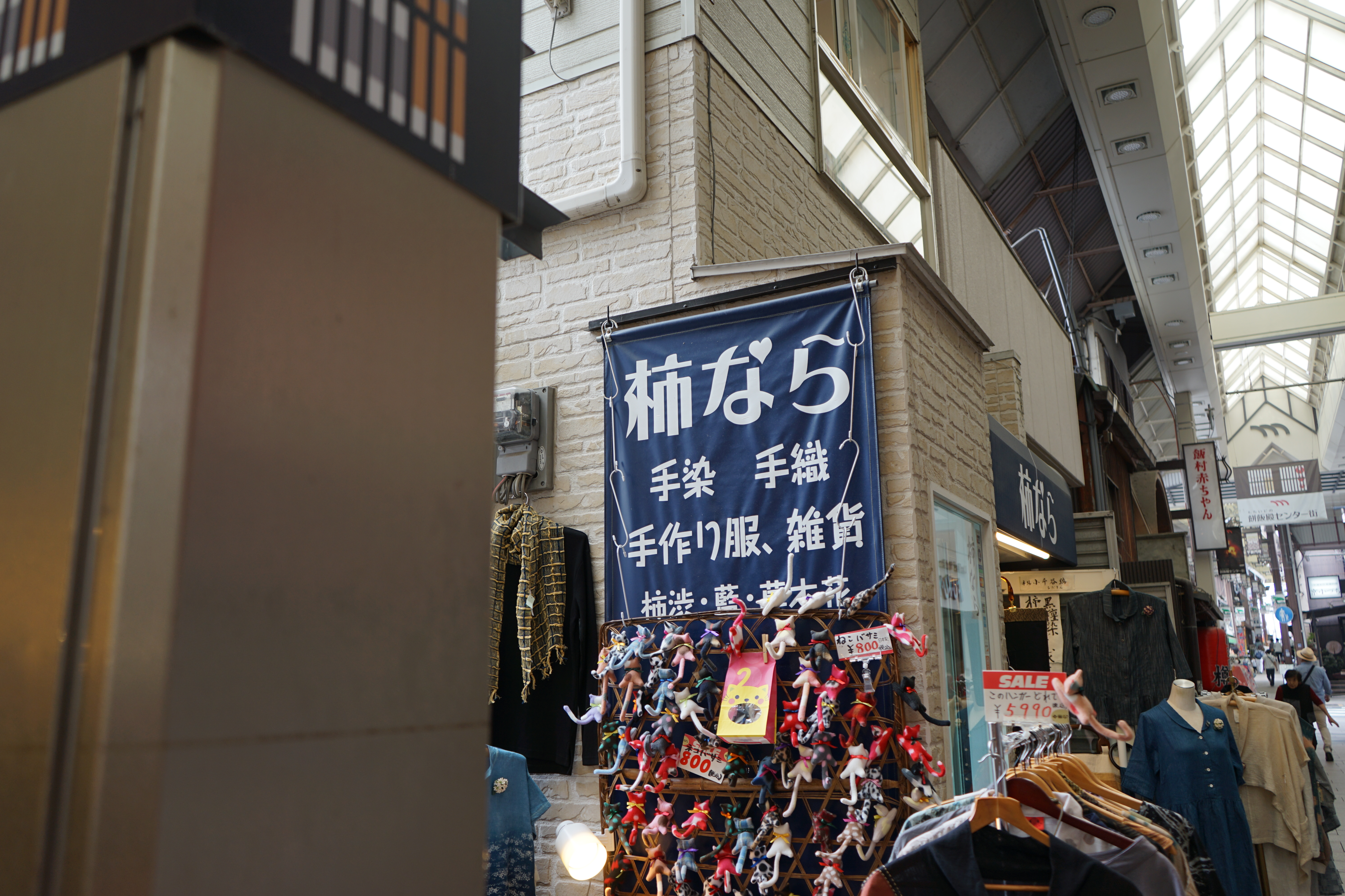 たびじたくさんはもちいどの商店街から路地に入ったところにあるのですが、この「柿なら」さんが目印です。この看板が見えたら左折です。