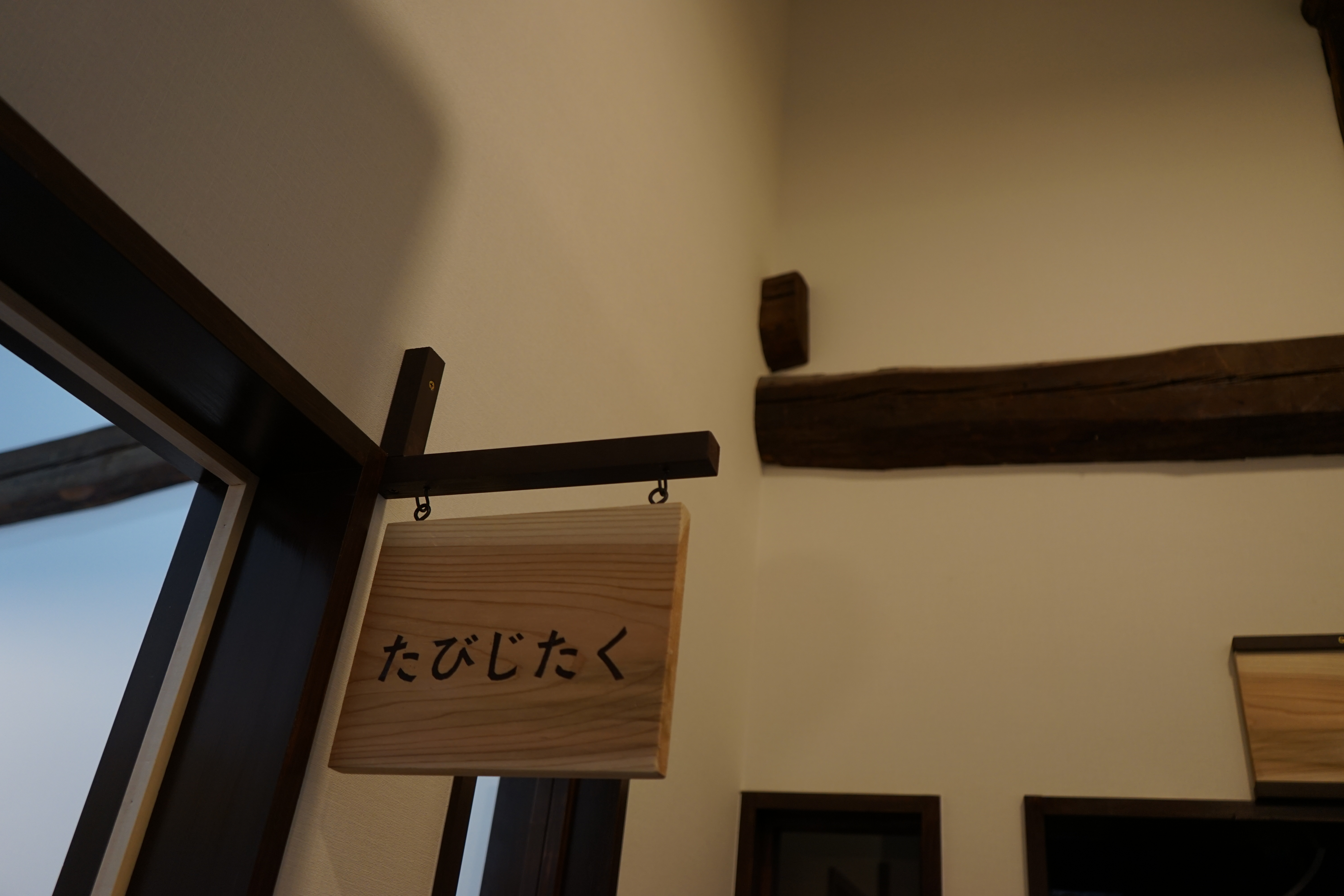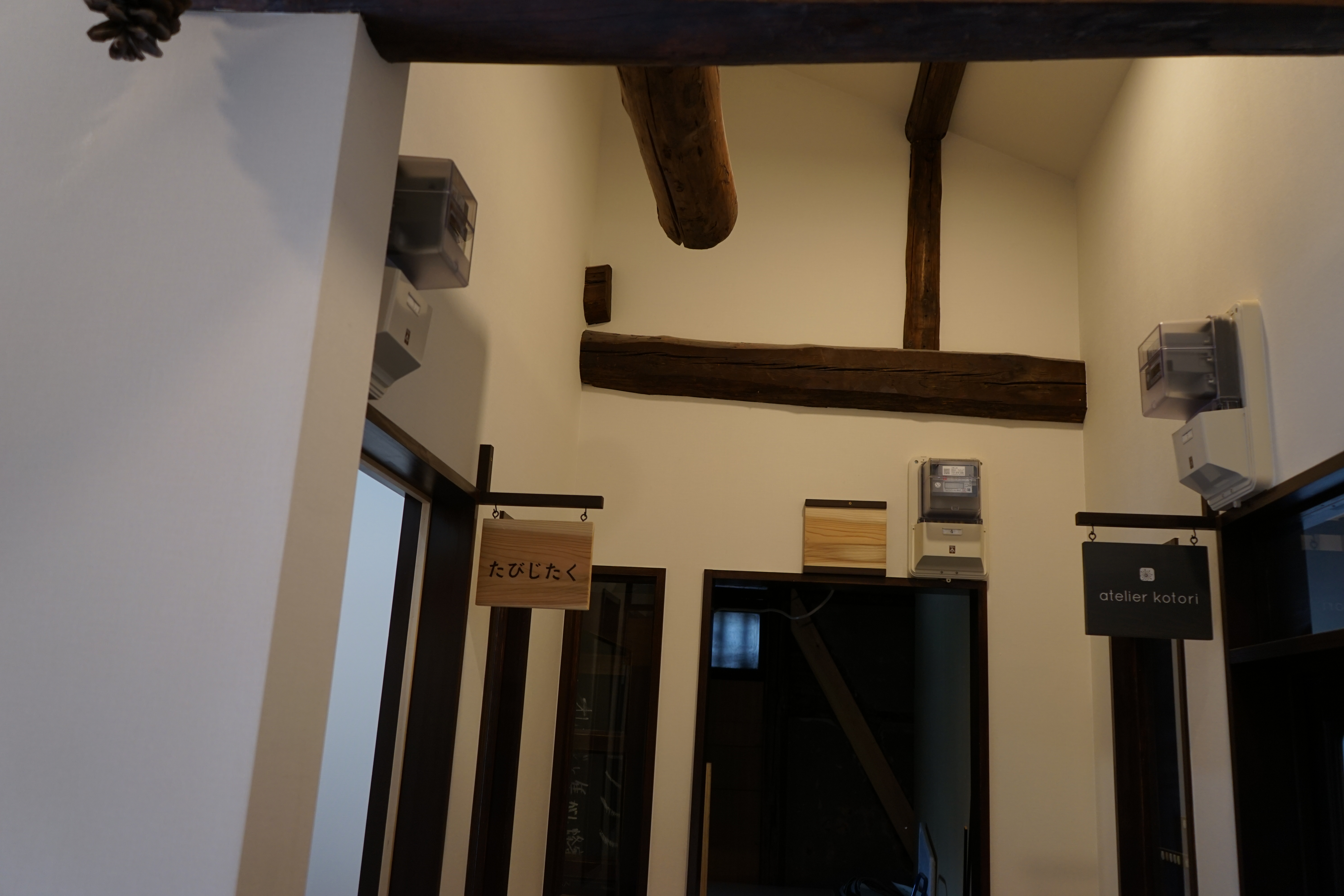 路地を歩いて1分くらいで、たびじたくさんのお店につきます。うーーん最近流行の古民家改造パターンのやつですねーいいですねーやっぱ古都には古民家が似合います。下にもお店が入ってたりしてるのですが、たびじたくさんは2階だと事前にお伺いしてたので、階段をあがります。お!階段の横にたびじたくさんの看板発見!!