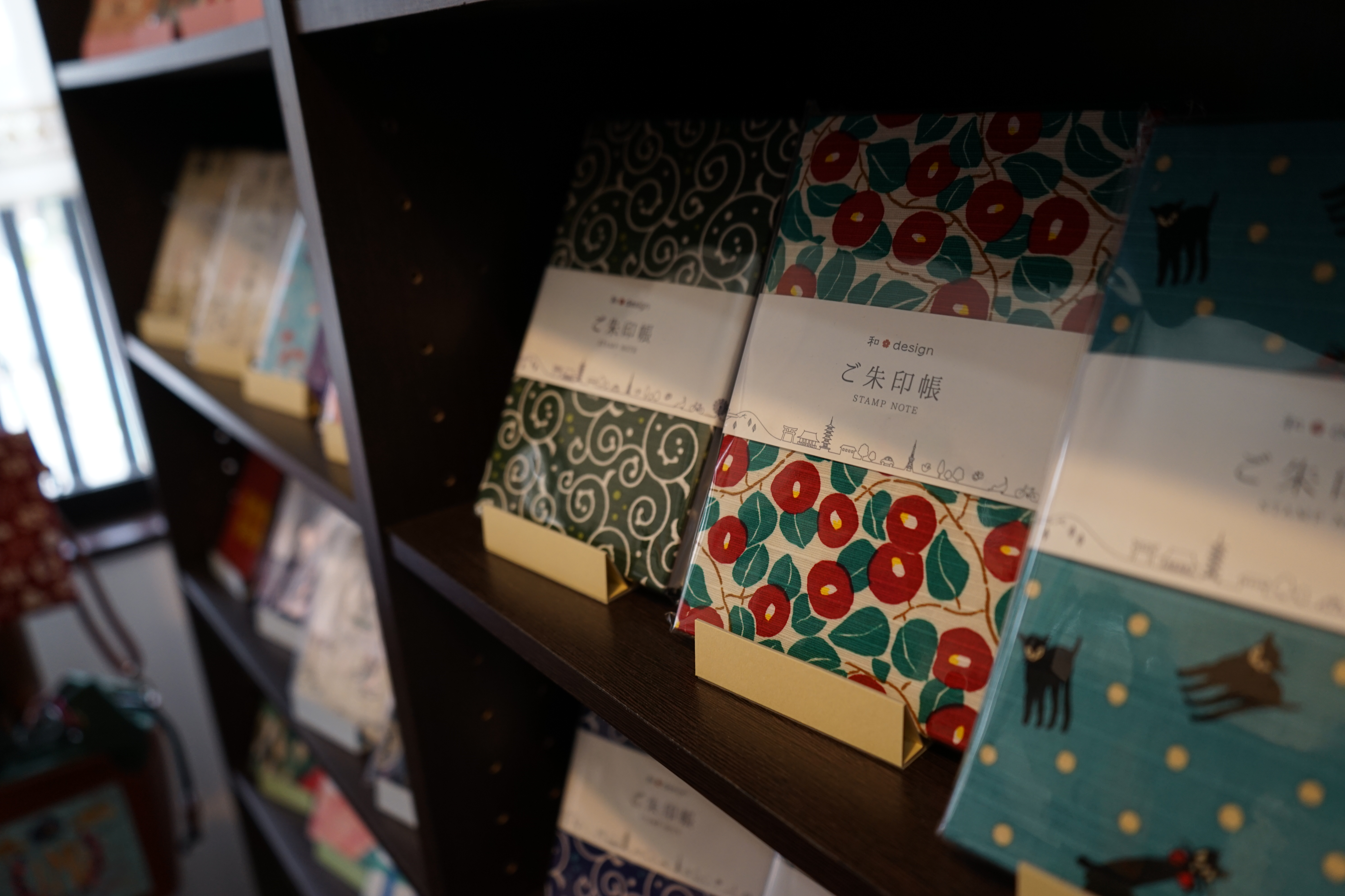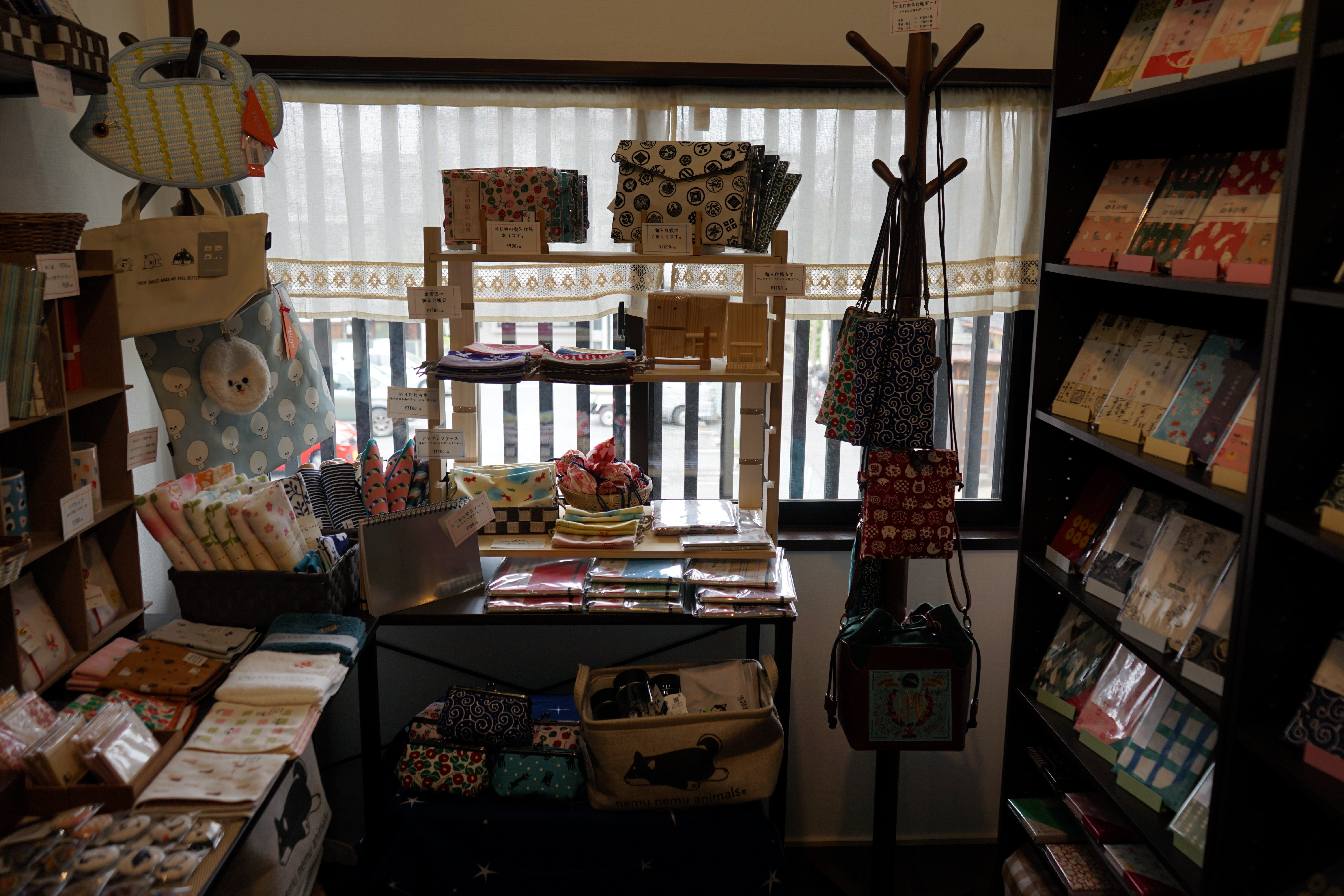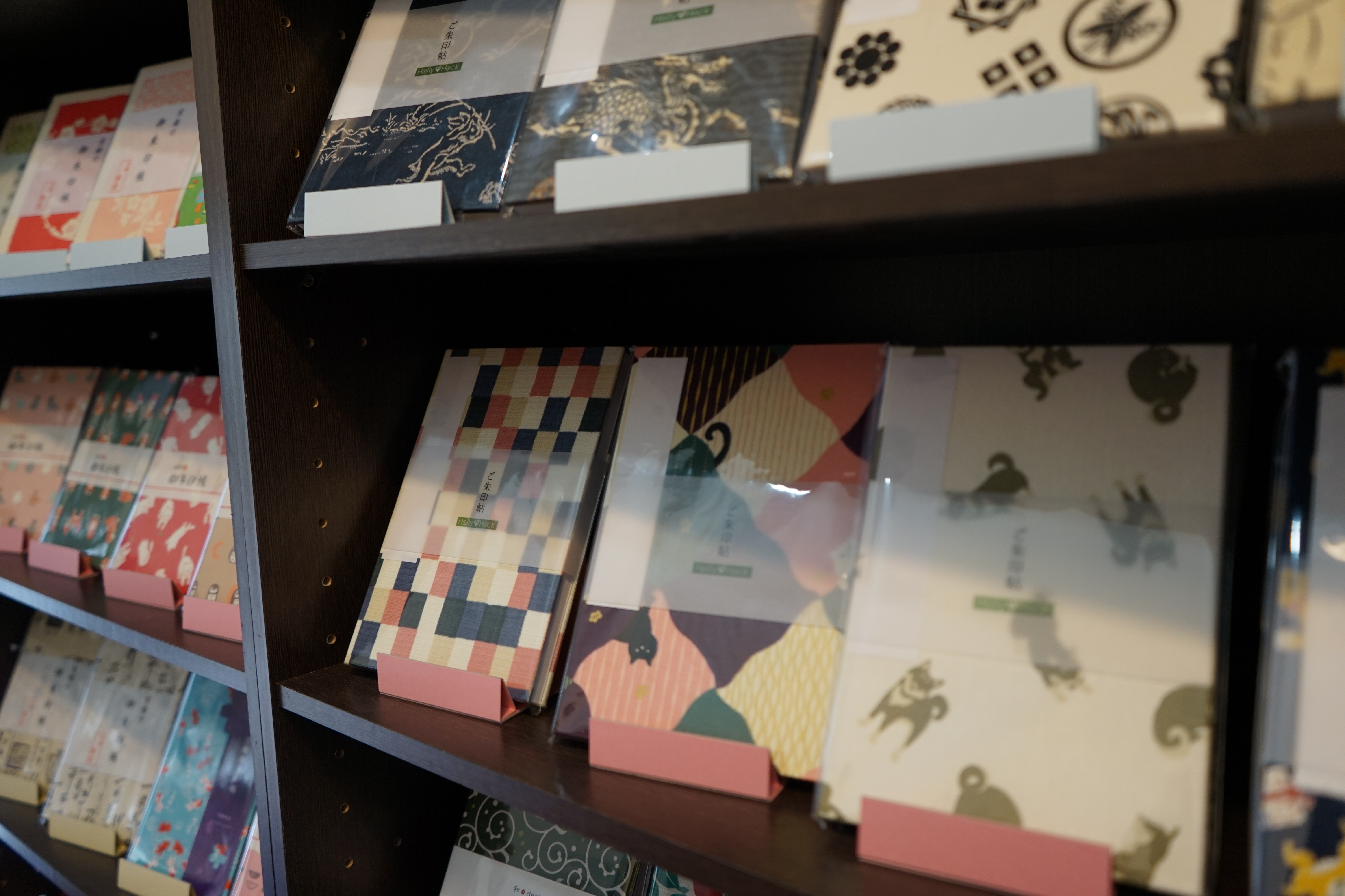 もちいどの商店街から路地に入った古民家を改築して作られた商業施設2Fにあるお店。店内はこじんまりとしているが、奈良では珍しく御朱印帳がずらりと並んでいる。